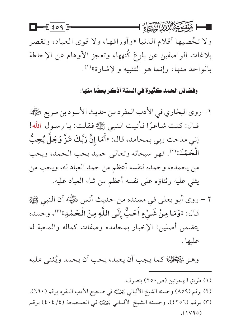١ - روى البخاري في الأدب المفرد من حديث الأسود بن سريع - رضي الله عنه - قال: كنت شاعرًا فأتيت النبي - صلى الله عليه وسلم - فقلت: يا رسول الله! إني مدحت ربي بمحامد، قال: «أَمَا إِنَّ رَبَّكَ عَزَّ وَجَلَّ يُحِبُّ الْحَمْدَ» (¬٢). فهو سبحانه وتعالى حميد يحب الحمد، ويحب من يحمده، وحمده لنفسه أعظم من حمد العباد له، ويحب من يثني عليه وثناؤه على نفسه أعظم من ثناء العباد عليه.