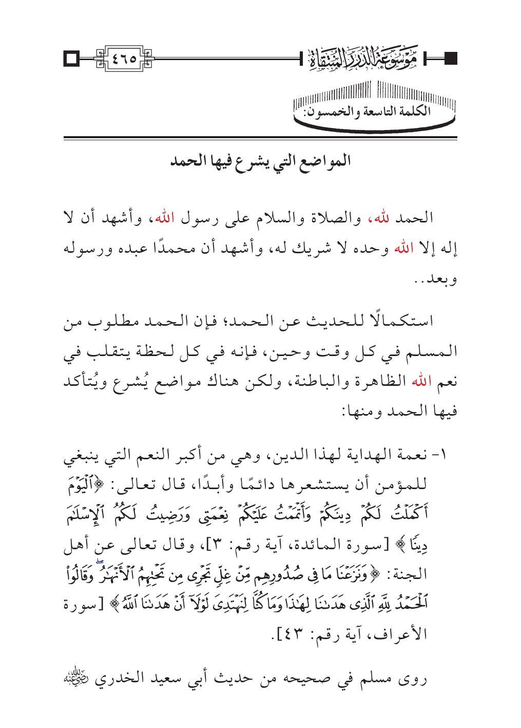 استكمالًا للحديث عن الحمد؛ فإن الحمد مطلوب من المسلم في كل وقت وحين، فإنه في كل لحظة يتقلب في نعم الله الظاهرة والباطنة، ولكن هناك مواضع يُشرع ويُتأكد فيها الحمد ومنها: