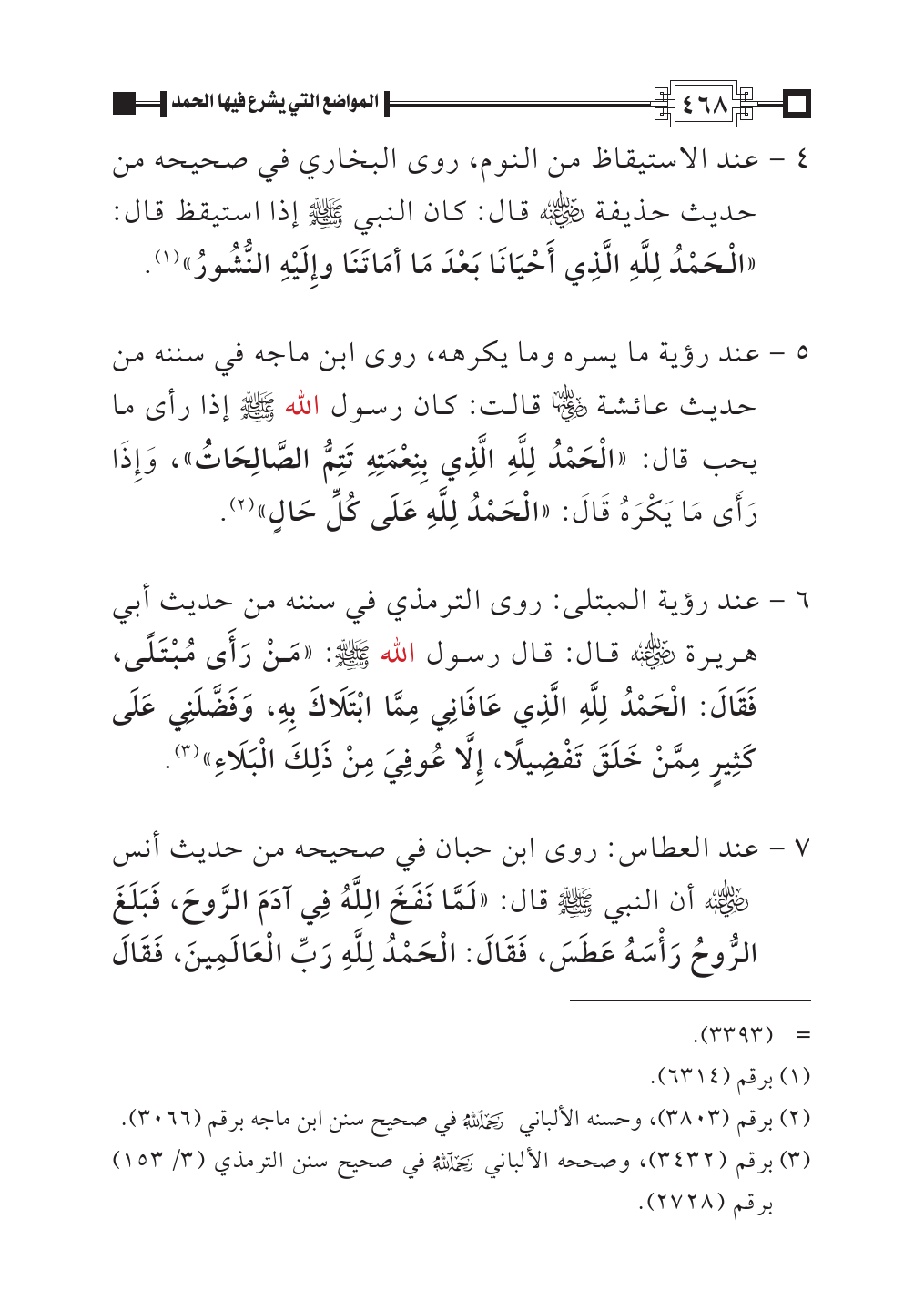 ٥ - عند رؤية ما يسره وما يكرهه، روى ابن ماجه في سننه من حديث عائشة - رضي الله عنها - قالت: كان رسول الله - صلى الله عليه وسلم - إذا رأى ما يحب قال: «الْحَمْدُ لِلَّهِ الَّذِي بِنِعْمَتِهِ تَتِمُّ الصَّالِحَاتُ»، وَإِذَا رَأَى مَا يَكْرَهُ قَالَ: «الْحَمْدُ لِلَّهِ عَلَى كُلِّ حَالٍ» (¬٢).