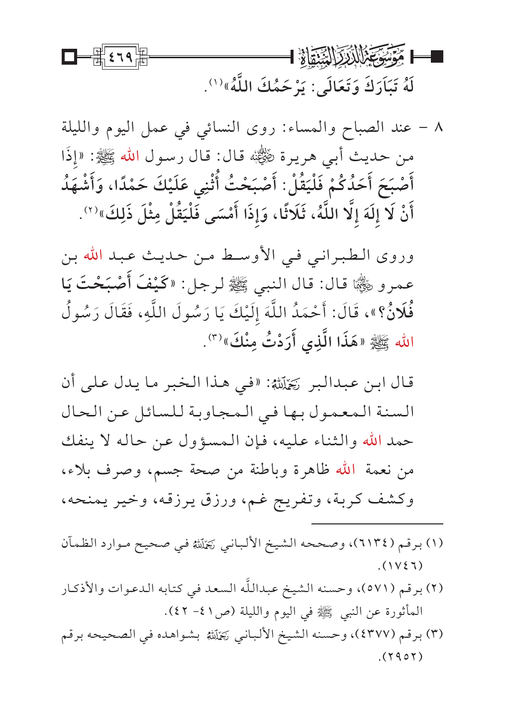 وروى الطبراني في الأوسط من حديث عبد الله بن عمرو - رضي الله عنهما - قال: قال النبي - صلى الله عليه وسلم - لرجل: «كَيْفَ أَصْبَحْتَ يَا فُلَانُ؟»، قَالَ: أَحْمَدُ اللَّهَ إِلَيْكَ يَا رَسُولَ اللَّهِ، فَقَالَ رَسُولُ الله - صلى الله عليه وسلم - «هَذَا الَّذِي أَرَدْتُ مِنْكَ» (¬٣).