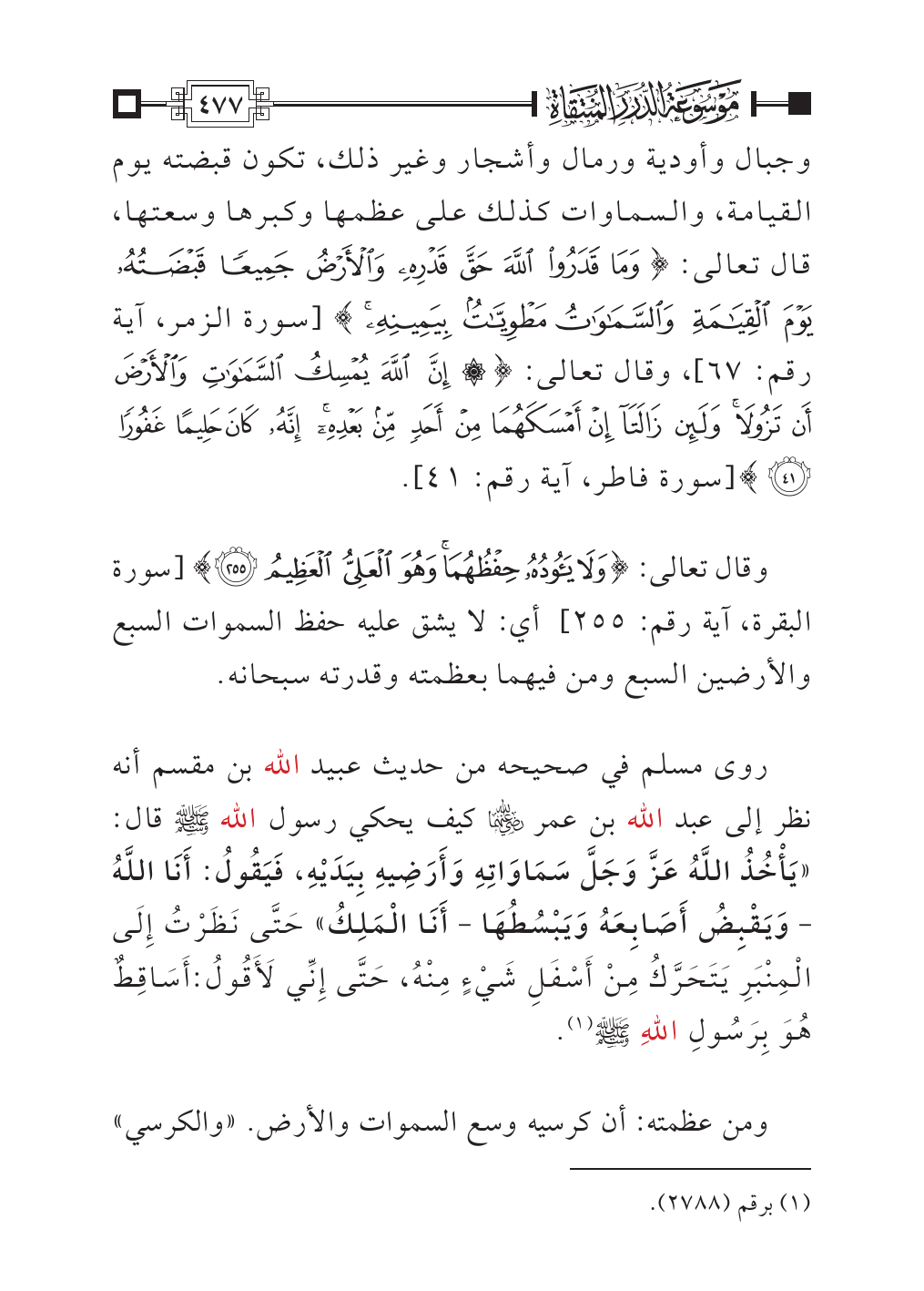 وجبال وأودية ورمال وأشجار وغير ذلك، تكون قبضته يوم القيامة، والسماوات كذلك على عظمها وكبرها وسعتها، قال تعالى: {وَمَا قَدَرُوا اللَّهَ حَقَّ قَدْرِهِ وَالْأَرْضُ جَمِيعًا قَبْضَتُهُ يَوْمَ الْقِيَامَةِ وَالسَّمَاوَاتُ مَطْوِيَّاتٌ بِيَمِينِهِ} [سورة الزمر، آية رقم: ٦٧]، وقال تعالى: {إِنَّ اللَّهَ يُمْسِكُ السَّمَاوَاتِ وَالْأَرْضَ أَنْ تَزُولَا وَلَئِنْ زَالَتَا إِنْ أَمْسَكَهُمَا مِنْ أَحَدٍ مِنْ بَعْدِهِ إِنَّهُ كَانَ حَلِيمًا غَفُورًا (٤١)} [سورة فاطر، آية رقم: ٤١].