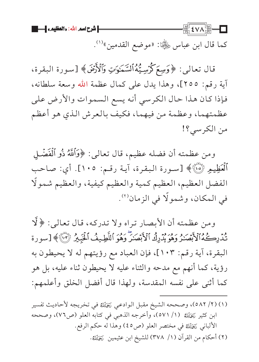 ومن عظمته أن الأبصار تراه ولا تدركه، قال تعالى: {لَا تُدْرِكُهُ الْأَبْصَارُ وَهُوَ يُدْرِكُ الْأَبْصَارَ وَهُوَ اللَّطِيفُ الْخَبِيرُ (١٠٣)} [سورة البقرة، آية رقم: ١٠٣]، فإن العباد مع رؤيتهم له لا يحيطون به رؤية، كما أنهم مع مدحه والثناء عليه لا يحيطون ثناء عليه، بل هو كما أثنى على نفسه المقدسة، ولهذا قال أفضل الخلق وأعلمهم: