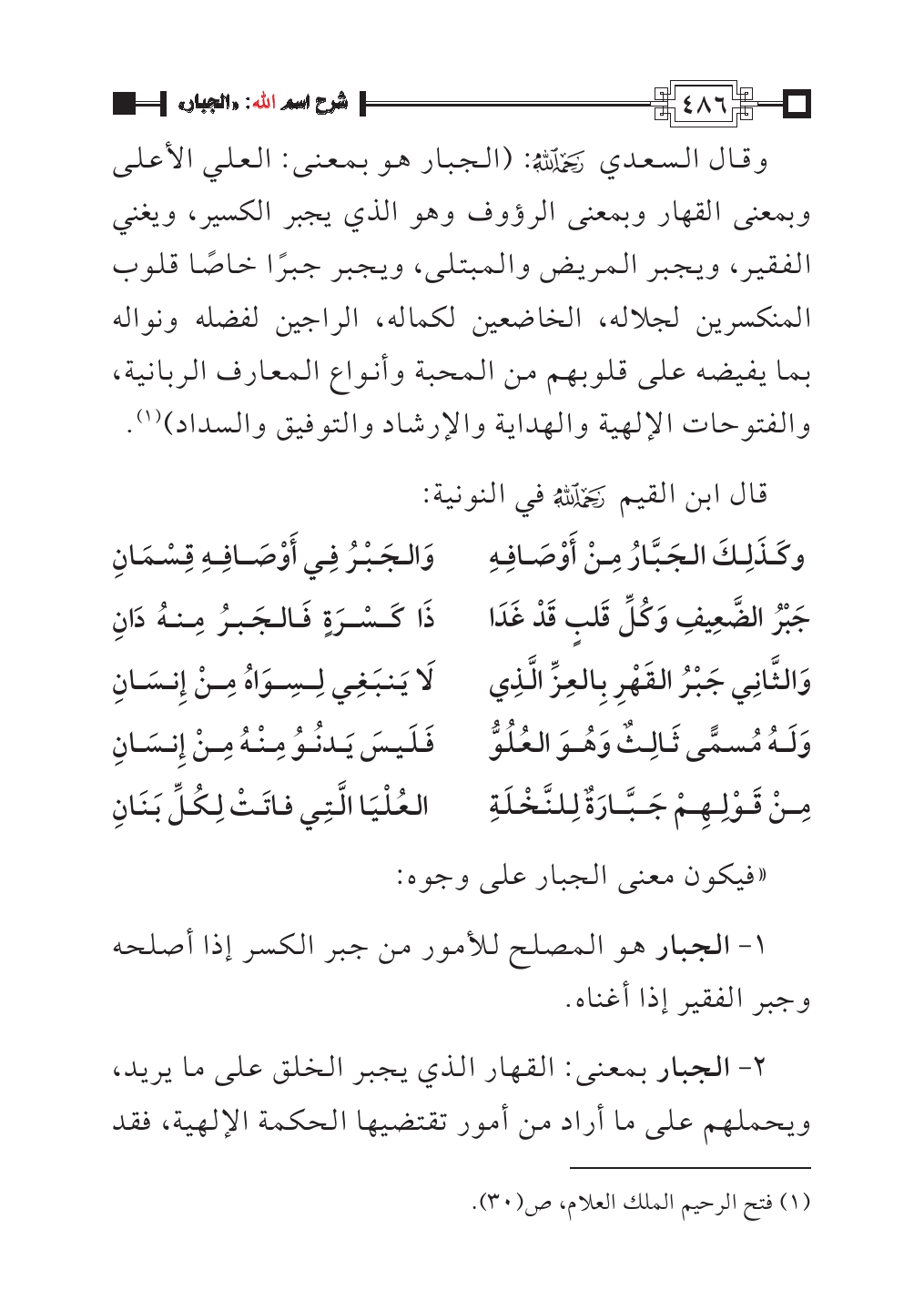 وقال السعدي - رحمه الله -: (الجبار هو بمعنى: العلي الأعلى وبمعنى القهار وبمعنى الرؤوف وهو الذي يجبر الكسير، ويغني الفقير، ويجبر المريض والمبتلى، ويجبر جبرًا خاصًا قلوب المنكسرين لجلاله، الخاضعين لكماله، الراجين لفضله ونواله بما يفيضه على قلوبهم من المحبة وأنواع المعارف الربانية، والفتوحات الإلهية والهداية والإرشاد والتوفيق والسداد) (¬١).