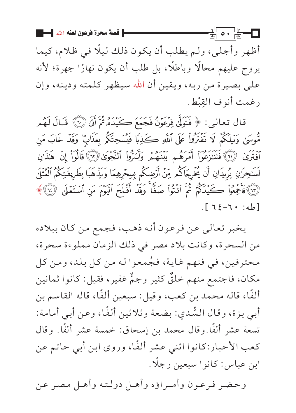 يخبر تعالى عن فرعون أنه ذهب، فجمع من كان ببلاده من السحرة، وكانت بلاد مصر في ذلك الزمان مملوءة سحرة، محترفين، في فنهم غاية، فجُمعوا له من كل بلد، ومن كل مكان، فاجتمع منهم خلقٌ كثير وجمٌّ غفير، فقيل: كانوا ثمانين ألفًا، قاله محمد بن كعب، وقيل: سبعين ألفًا، قاله القاسم بن أبي بزة، وقال السُّدي: بضعة وثلاثين ألفًا، وعن أبي أمامة: تسعة عشر ألفًا. وقال محمد بن إسحاق: خمسة عشر ألفًا. وقال كعب الأحبار: كانوا اثني عشر ألفًا، وروى ابن أبي حاتم عن ابن عباس: كانوا سبعين رجلًا.