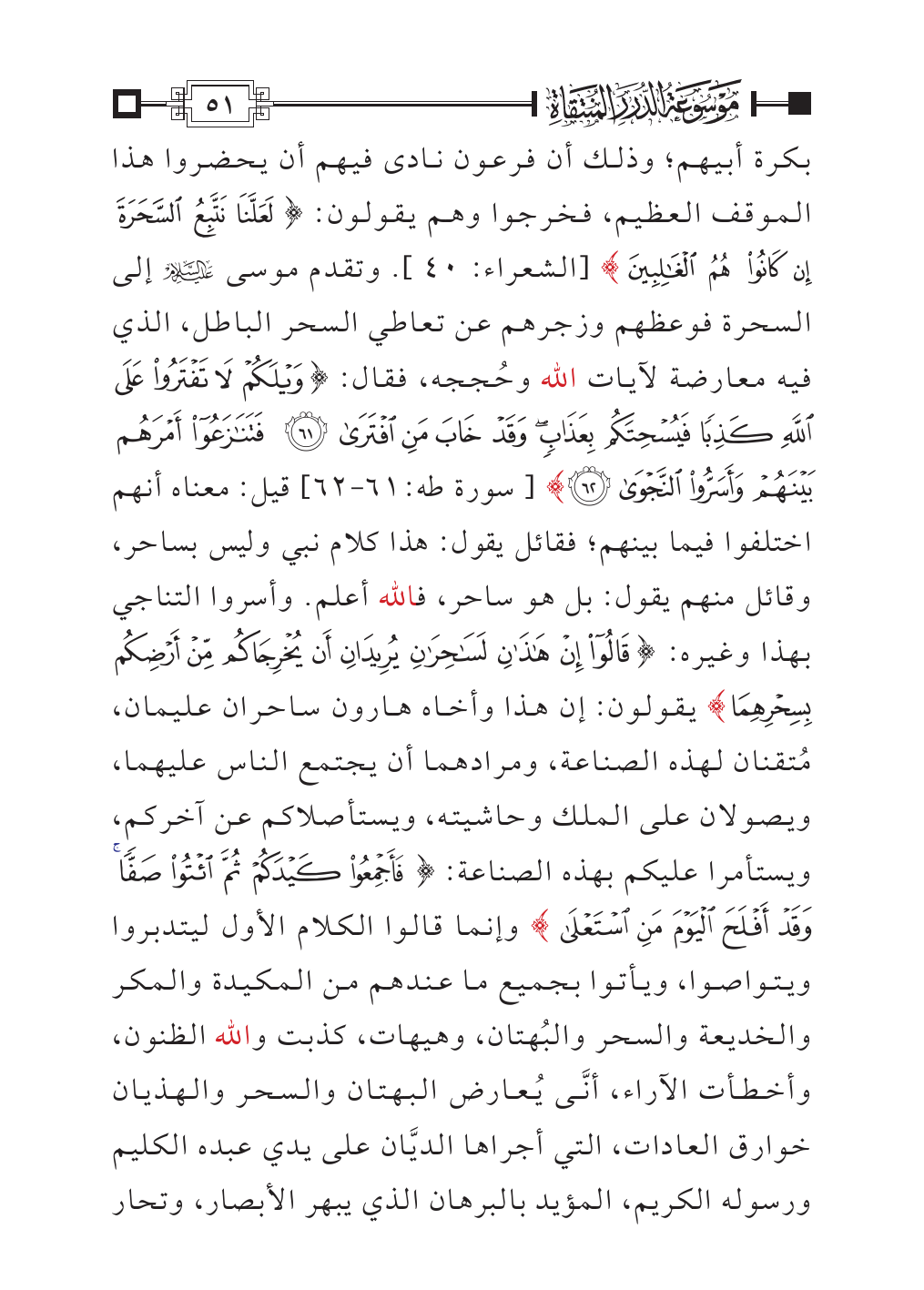 بكرة أبيهم؛ وذلك أن فرعون نادى فيهم أن يحضروا هذا الموقف العظيم، فخرجوا وهم يقولون: {لَعَلَّنَا نَتَّبِعُ السَّحَرَةَ إِنْ كَانُوا هُمُ الْغَالِبِينَ} [الشعراء: ٤٠]. وتقدم موسى - عليه السلام - إلى السحرة فوعظهم وزجرهم عن تعاطي السحر الباطل، الذي فيه معارضة لآيات الله وحُججه، فقال: {وَيْلَكُمْ لَا تَفْتَرُوا عَلَى اللَّهِ كَذِبًا فَيُسْحِتَكُمْ بِعَذَابٍ وَقَدْ خَابَ مَنِ افْتَرَى (٦١) فَتَنَازَعُوا أَمْرَهُمْ بَيْنَهُمْ وَأَسَرُّوا النَّجْوَى (٦٢)} [سورة طه:٦١ - ٦٢] قيل: معناه أنهم اختلفوا فيما بينهم؛ فقائل يقول: هذا كلام نبي وليس بساحر، وقائل منهم يقول: بل هو ساحر، فالله أعلم. وأسروا التناجي بهذا وغيره: {قَالُوا إِنْ هَذَانِ لَسَاحِرَانِ يُرِيدَانِ أَنْ يُخْرِجَاكُمْ مِنْ أَرْضِكُمْ بِسِحْرِهِمَا} يقولون: إن هذا وأخاه هارون ساحران عليمان، مُتقنان لهذه الصناعة، ومرادهما أن يجتمع الناس عليهما، ويصولان على الملك وحاشيته، ويستأصلاكم عن آخركم، ويستأمرا عليكم بهذه الصناعة: {فَأَجْمِعُوا كَيْدَكُمْ ثُمَّ ائْتُوا صَفًّا وَقَدْ أَفْلَحَ الْيَوْمَ مَنِ اسْتَعْلَى} وإنما قالوا الكلام الأول ليتدبروا ويتواصوا، ويأتوا بجميع ما عندهم من المكيدة والمكر والخديعة والسحر والبُهتان، وهيهات، كذبت والله الظنون، وأخطأت الآراء، أنَّى يُعارض البهتان والسحر والهذيان خوارق العادات، التي أجراها الديَّان على يدي عبده الكليم ورسوله الكريم، المؤيد بالبرهان الذي يبهر الأبصار، وتحار