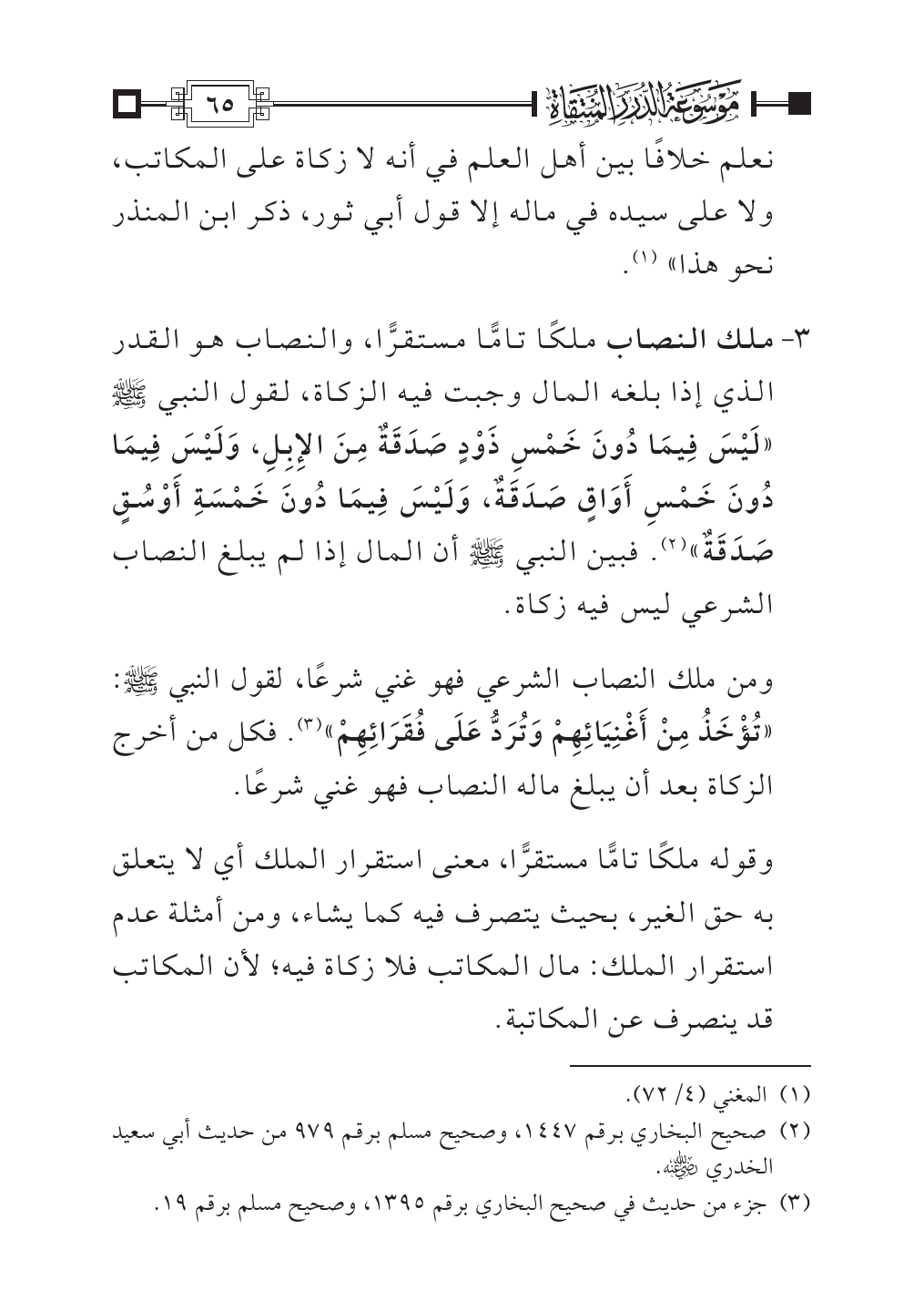 ٣ - ملك النصاب ملكًا تامًّا مستقرًّا، والنصاب هو القدر الذي إذا بلغه المال وجبت فيه الزكاة، لقول النبي - صلى الله عليه وسلم - «لَيْسَ فِيمَا دُونَ خَمْسِ ذَوْدٍ صَدَقَةٌ مِنَ الإِبِلِ، وَلَيْسَ فِيمَا دُونَ خَمْسِ أَوَاقٍ صَدَقَةٌ، وَلَيْسَ فِيمَا دُونَ خَمْسَةِ أَوْسُقٍ صَدَقَةٌ» (¬٢). فبين النبي - صلى الله عليه وسلم - أن المال إذا لم يبلغ النصاب الشرعي ليس فيه زكاة.