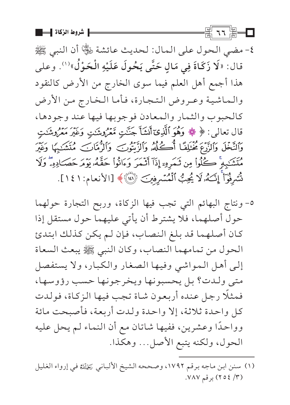 ٥ - ونتاج البهائم التي تجب فيها الزكاة، وربح التجارة حولهما حول أصلهما، فلا يشترط أن يأتي عليهما حول مستقل إذا كان أصلهما قد بلغ النصاب، فإن لم يكن كذلك ابتدئ الحول من تمامهما النصاب، وكان النبي - صلى الله عليه وسلم - يبعث السعاة إلى أهل المواشي وفيها الصغار والكبار، ولا يستفصل متى ولدت؟ بل يحسبونها ويخرجونها حسب رؤوسها، فمثلًا رجل عنده أربعون شاة تجب فيها الزكاة، فولدت كل واحدة ثلاثة، إلا واحدة ولدت أربعة، فأصبحت مائة وواحدًا وعشرين، ففيها شاتان مع أن النماء لم يحل عليه الحول، ولكنه يتبع الأصل ... وهكذا.