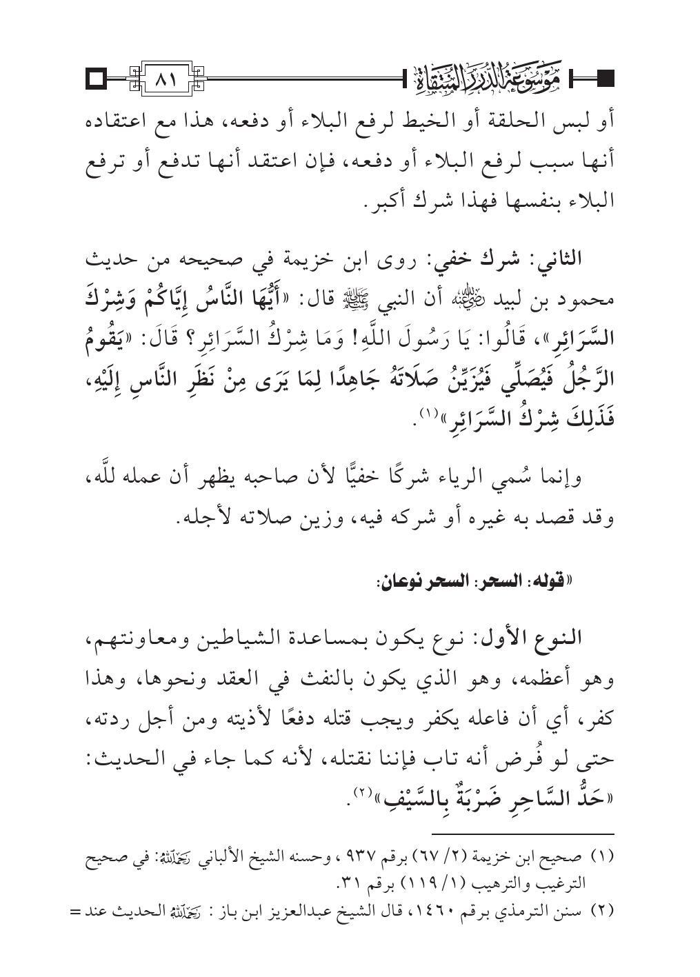 الثاني: شرك خفي: روى ابن خزيمة في صحيحه من حديث محمود بن لبيد - رضي الله عنه - أن النبي - صلى الله عليه وسلم - قال: «أَيُّهَا النَّاسُ إِيَّاكُمْ وَشِرْكَ السَّرَائِرِ»، قَالُوا: يَا رَسُولَ اللَّهِ! وَمَا شِرْكُ السَّرَائِرِ؟ قَالَ: «يَقُومُ الرَّجُلُ فَيُصَلِّي فَيُزَيِّنُ صَلَاتَهُ جَاهِدًا لِمَا يَرَى مِنْ نَظَرِ النَّاسِ إِلَيْهِ، فَذَلِكَ شِرْكُ السَّرَائِرِ» (¬١).