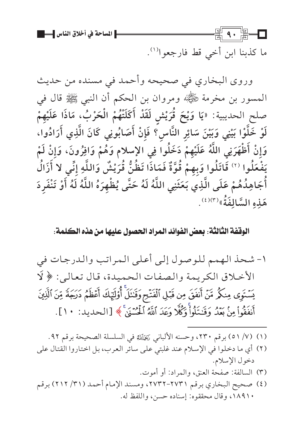 وروى البخاري في صحيحه وأحمد في مسنده من حديث المسور بن مخرمة - رضي الله عنه - ومروان بن الحكم أن النبي - صلى الله عليه وسلم - قال في صلح الحديبية: «يَا وَيْحَ قُرَيْشٍ لَقَدْ أَكَلَتْهُمْ الْحَرْبُ، مَاذَا عَلَيْهِمْ لَوْ خَلَّوْا بَيْنِي وَبَيْنَ سَائِرِ النَّاسِ؟ فَإِنْ أَصَابُونِي كَانَ الَّذِي أَرَادُوا، وَإِنْ أَظْهَرَنِي اللَّهُ عَلَيْهِمْ دَخَلُوا فِي الإسلام وَهُمْ وَافِرُونَ، وَإِنْ لَمْ يَفْعَلُوا (¬٢)