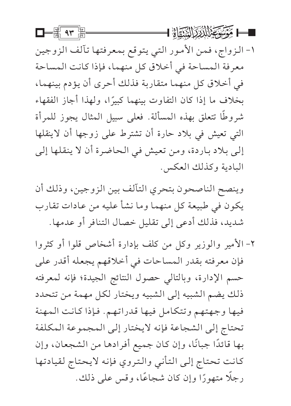 ٢ - الأمير والوزير وكل من كلف بإدارة أشخاص قلوا أو كثروا فإن معرفته بقدر المساحات في أخلاقهم يجعله أقدر على حسم الإدارة، وبالتالي حصول النتائج الجيدة؛ فإنه لمعرفته ذلك يضم الشبيه إلى الشبيه ويختار لكل مهمة من تتحدد فيها وجهتهم وتتكامل فيها قدراتهم. فإذا كانت المهنة تحتاج إلى الشجاعة فإنه لايختار إلى المجموعة المكلفة بها قائدًا جبانًا، وإن كان جميع أفرادها من الشجعان، وإن كانت تحتاج إلى التأني والتروي فإنه لايحتاج لقيادتها رجلًا متهورًا وإن كان شجاعًا، وقس على ذلك.