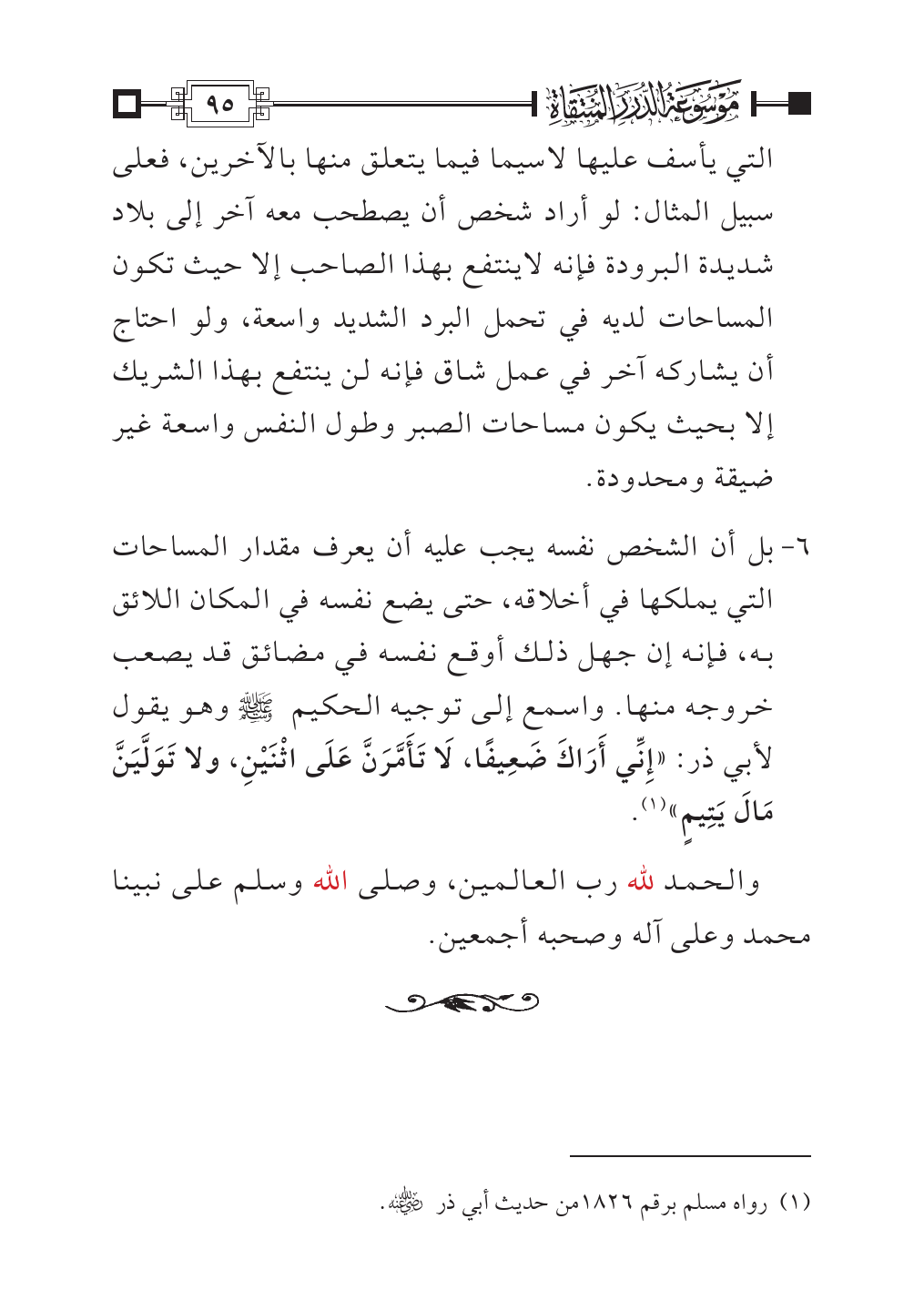 ٦ - بل أن الشخص نفسه يجب عليه أن يعرف مقدار المساحات التي يملكها في أخلاقه، حتى يضع نفسه في المكان اللائق به، فإنه إن جهل ذلك أوقع نفسه في مضائق قد يصعب خروجه منها. واسمع إلى توجيه الحكيم - صلى الله عليه وسلم - وهو يقول لأبي ذر: «إِنِّي أَرَاكَ ضَعِيفًا، لَا تَأَمَّرَنَّ عَلَى اثْنَيْنِ، ولا تَوَلَّيَنَّ مَالَ يَتِيمٍ» (¬١).