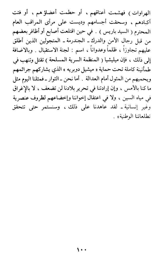 الهراوات) فهشمت أعناقهم، أو حطمت أعضاؤهم، أو فتت أكبادهم، وسحقت أجسامهم وديست على مرأى المراقب العام المحترم (السيد باريس). في حين اقتلعت أصابع أو أظافر بعضهم من قبل رجال الأمن والدرك - الجندرمة - المتجولين الذين أطلق عليهم تجاوزا، ظلما وعدوانا، اسم: لجنة الاستقبال. وبالاضافة الى ذلك، فإن ميليشيا (المنظمة السرية المسلحة) تقتل وتنهب في طمأنينة كاملة تحت حماية (ميشيل دوبريه) الذي يشاركهم جرائمهم ويحميهم من المثول أمام العدالة. أما نحن - الثوار - فمثلنا اليوم مثل ما كنا بالأمس، وإن إرادتنا في تحرير بلادنا لن تضعف، لا بالإغراق في مياه السين، ولا في اعتقال إخواننا وإخضاعهم لظروف عنصرية وغير إنسانية - لقد عاهدنا على ذلك، وسنستمر حتى تتحقق تطلعاتنا الوطنية).