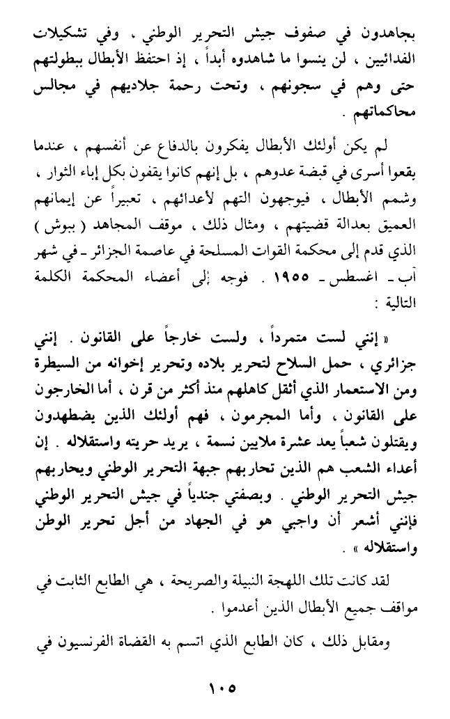 (إنني لست متمردا، ولست خارجا على القانون. إنني جزائري، حمل السلاح لتحرير بلاده وتحرير إخوانه من السيطرة ومن الاستعمار الذي أثقل كاهلهم منذ أكثر من قرن، أما الخارجون على القانون، وأما المجرمون، فهم أولئك الذين يضطهدون ويقتلون شعبا يعد عشرة ملايين نسمة، يريد حريته واستقلاله. إن أعداء الشعب هم الذين تحاربهم جهة التحرير الوطني ويحاربهم جيش التحرير الوطني. وبصفتي جنديا في جيش التحرير الوطني فإنني أشعر أن واجبي هو في الجهاد من أجل تحرير الوطن واستقلاله).