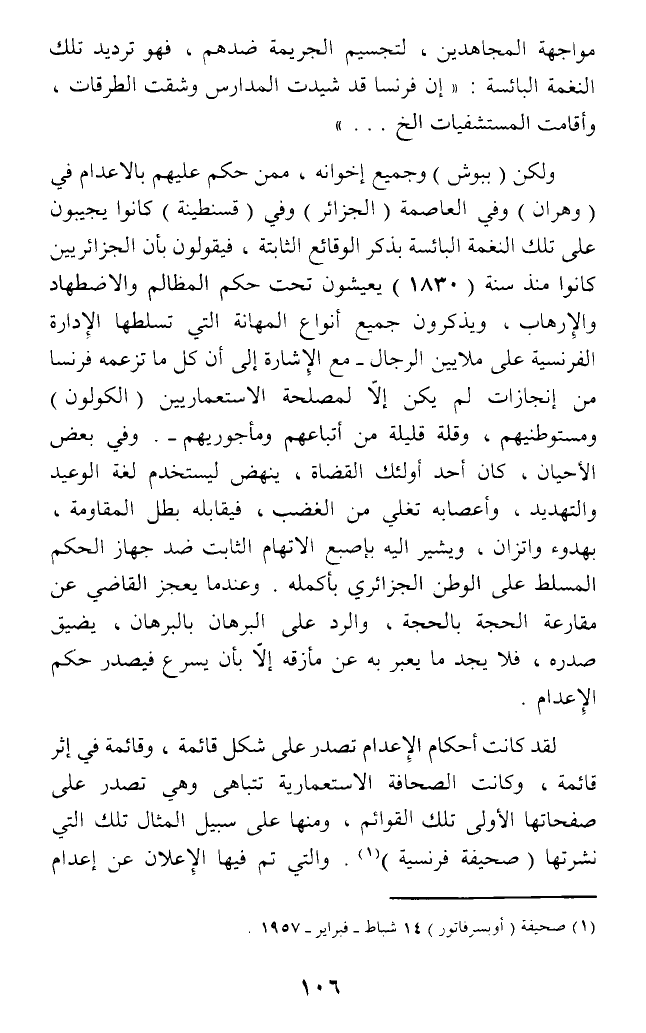 ولكن (ببوش) وجميع إخوانه، ممن حكم عليهم بالاعدام في (وهران) وفي العاصمة (الجزائر) وفي (قسنطينة) كانوا يجيبون على تلك النغمة البائسة بذكر الوقائع الثابتة، فيقولون بأن الجزائريين كانوا منذ سنة (1830) يعيشون تحت حكم المظالم والاضطهاد والإرهاب، وينكرون جميع أنواع المهانة التي تسلطها الإدارة الفرنسية على ملايين الرجال - مع الإشارة إلى أن كل ما تزعمه فرنسا من إنجازات لم يكن إلا لمصلحة الاستعماريين (الكولون) ومستوطنيهم، وقلة قليلة من أتباعهم ومأجوريهم -. وفي بعض الأحيان، كان أحد أولئك القضاة، ينهض ليستخدم لغة الوعيد والتهديد، وأعصابه تغلي من الغضب، فيقابله بطل المقاومة، بهدوء واتزان، ويشير اليه بإصبع الاتهام الثابت ضد جهاز الحكم المسلط على الوطن الجزائري بأكمله. وعندما يعجز القاضي عن مقارعة الحجة بالحجة، والرد على البرهان بالبرهان، يضيق صدره، فلا يجد ما يعبر به عن مأزقه إلا بأن يسرع فيصدر حكم الإعدام.