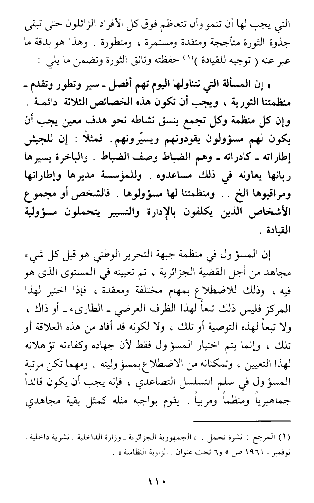 (إن المسألة التي نتناولها اليوم تهم أفضل - سير وتطور وتقدم - منظمتنا الثورية، ويجب أن تكون هذه الخصائص الثلاثة دائمة. وإن كل منظمة وكل تجمع ينسق نشاطه نحو هدف معين يجب أن يكون لهم مسؤولون يقودونهم ويسيرونهم. فمثلا: إن للجيش إطاراته - كادراته - وهم الضباط وصف الضباط. والباخرة يسيرها ربانها يعاونه في ذلك مساعدوه. وللمؤسسة مديرها وإطاراتها ومراقبوها الخ .. ومنظمتنا لها مسؤولوها. فالشخص أو مجموع الأشخاص الذين يكلفون بالإدارة والتسيير يتحملون مسؤولية القيادة.