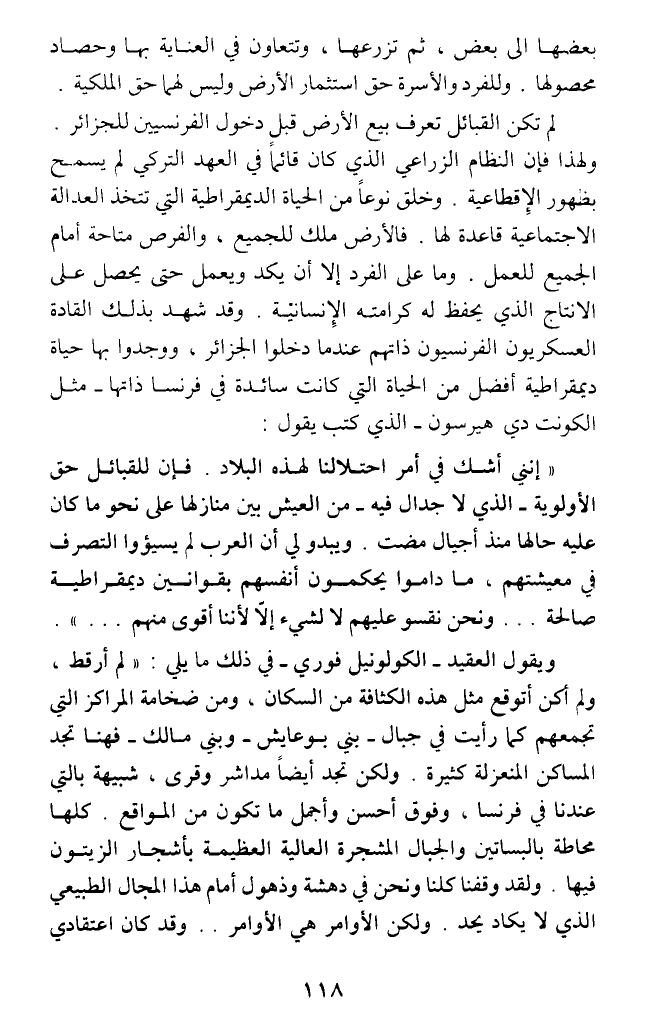 لم تكن القبائل تعرف بيع الأرض قبل دخول الفرنسيين للجزائر. ولهذا فإن النظام الزراعي الذي كان قائما في العهد التركي لم يسمح بظهور الإقطاعية. وخلق نوعا من الحياة الديمقراطية التي تتخذ العدالة الاجتماعية قاعدة لها. فالأرض ملك للجميع، والفرص متاحة أمام الجميع للعمل. وما على الفرد إلا أن يكد ويعمل حتى يحصل على الانتاج الذي يحفظ لا كرامته الإنسانية. وقد شهد بذلك القادة العسكريون الفرنسيون ذاتهم عندما دخلوا الجزائر، ووجدوا بها حياة ديمقراطية أفضل من الحياة التي كانت سائدة في فرنسا ذاتها - مثل الكونت دي هيرسون - الذي كتب يقول: