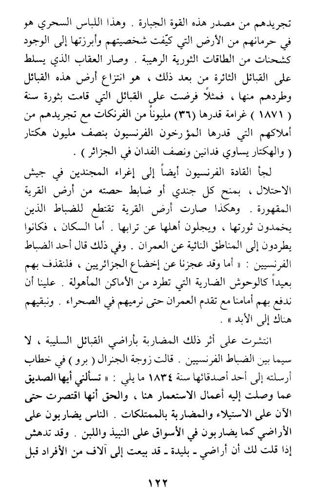 تجريدهم من مصدر هذه القوة الجبارة. وهذا اللباس السحري هو في حرمانهم من الأرض التي كيفت شخصيتهم وأبرزتها إلى الوجود كشحنات من الطاقات الثورية الرهيبة. وصار العقاب الذي يسلط على القبائل الثائرة من بعد ذلك، هو انتزاع أرض هذه القبائل وطردهم منها، فمثلا فرضت على القبائل التي قامت بثورة سنة (1871) غرامة قدرها (36) مليونا من الفرنكات مع تجريدهم من أملاكهم التي قدرها المؤرخون الفرنسيون بنصف مليون هكتار (والهكتار يساوي فدانين ونصف الفدان في الجزائر).