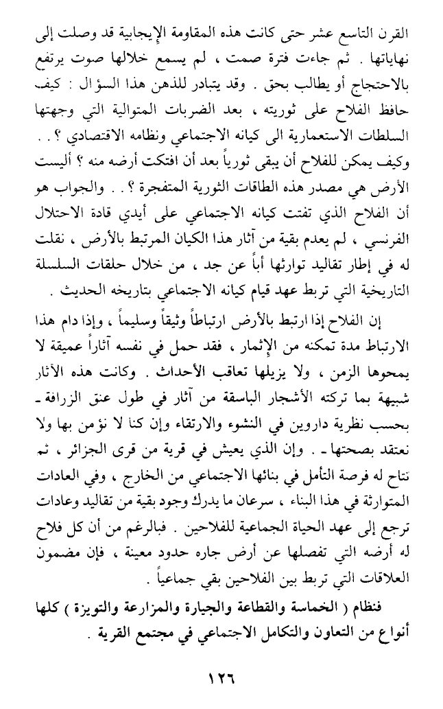 إن الفلاح إذا ارتبط بالأرض ارتباطا وثيقا وسليما، وإذا دام هذا الارتباط مدة تمكنه من الإثمار، فقد حمل في نفسه آثارا عميقة لا يمحوها الزمن، ولا يزيلها تعاقب الأحداث. وكانت هذه الآثار شبيهة بما تركته الأشجار الباسقة من آثار في طول عنق الزرافة - بحسب نظرية داروين في النشوء والارتقاء وإن كنا لا نؤمن بها والا نعتقد بصحتها -. وإن الذي يعيش في قرية من قرى الجزائر، ثم تتاح له فرصة التأمل في بنائها الاجتماعي من الخارج، وفي العادات المتوارثة في هذا البناء، سرعان ما يدرك وجود بقية من تقاليد وعادات ترجع إلى عهد الحياة الجماعية للفلاحين. فبالرغم من أن كل فلاح له أرضه التي تفصلها عن أرض جاره حدود معينة، فإن مضمون العلاقات التي تربط بين الفلاحين بقي جماعيا.