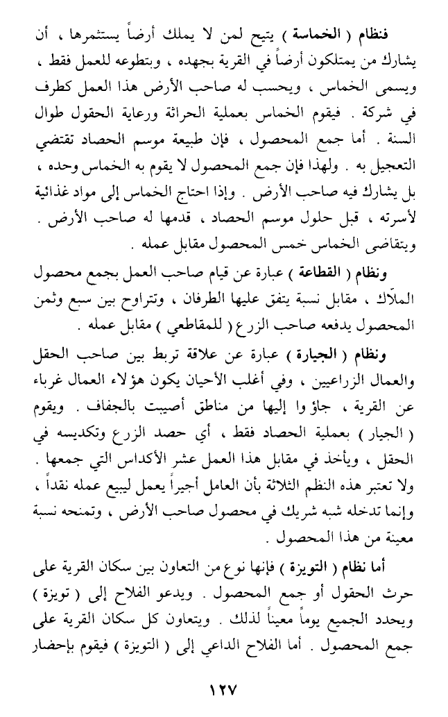 فنظام (الخماسة) يتيح لمن لا يملك أرضا يستثمرها، أن يشارك من يمتلكون أرضا في القرية بجهده، وبتطوعه للعمل فقط، ويسمى الخماس، ويحسب له صاحب الأرض هذا العمل كطرف في شركة. فيقوم الخماس بعملية الحراثة ورعاية الحقول طوال السنة. أما جمع المحصول، فإن طبيعة موسم الحصاد تقتضي التعجيل به. ولهذا فإن جمع المحصول لا يقوم به الخماس وحده، بل يشارك فيه صاحب الأرض. وإذا احتاج الخماس إلى مواد غذائية لأسرته، قبل حلول موسم الحصاد، قدمها له صاحب الأرض. ويتقاضى الخماس حمس المحصول مقابل عمله.