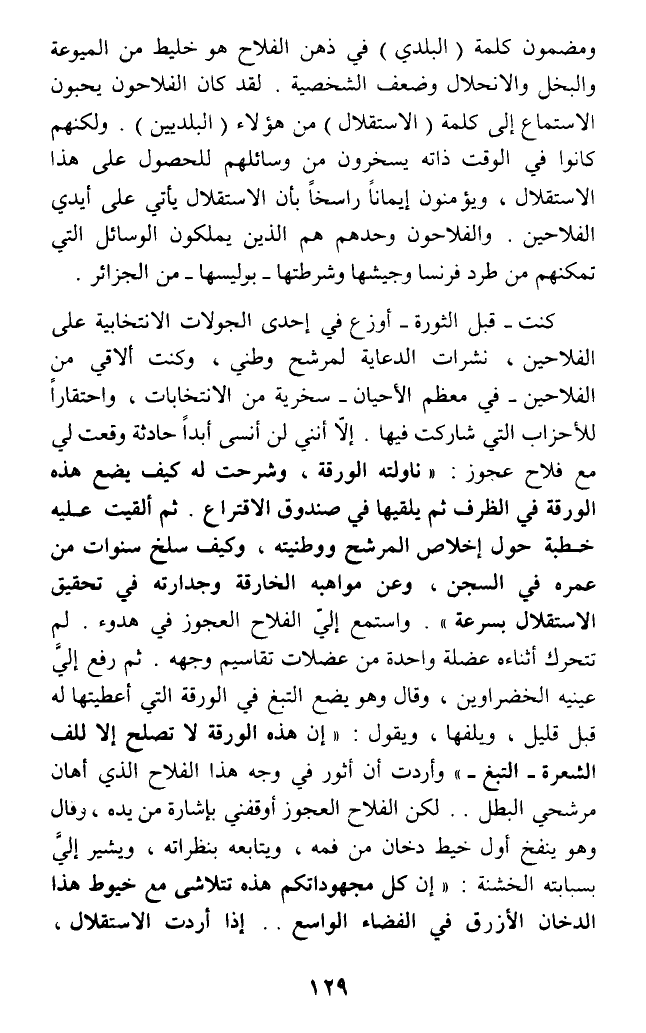كنت - قبل الثورة - أوزع في إحدى الجولات الانتخابية على الفلاحين، نشرات الدعاية لمرشح وطني، وكنت ألاقي من الفلاحين - في معظم الأحيان - سخرية من الانتخابات، واحتقارا للأحزاب التي شاركت فيها. إلا أنني لن أنسى أبدا حادثة وقعت لي مع فلاح عجوز:1 (ناولته الورقة، وشرحت له كيف يضع هذه الورقة في الظرف ثم يلقيها في صندوق الاقتراع. ثم ألقيت عليه خطبة حول إخلاص المرشح ووطنيته، وكيف سلخ سنوات من عمره في السجن، وعن مواهبه الخارقة وجدارته في تحقيق الاستقلال بسرعة). واستمع إلي الفلاح العجوز في هدوء. لم تتحرك أثناءه عضلة واحدة من عضلات تقاسيم وجهه. ثم رفع إلي عينيه الخضراوين، وقال وهو يضع التبغ في الورقة التي أعطيتها له قبل قليل، ويلفها، ويقول: (إن هذه الورقة لا تصلح إلا للف الشعرة - التبغ -) وأردت أن أثور في وجه هذا الفلاح الذي أهان مرشحي البطل .. لكن الفلاح العجوز أوقفني بإشارة من يده، وقال وهو ينفخ أول خيط دخان من فمه، ويتابعه بنظراته، ويشير إلي بسبابته الخشنة: (إن كل مجهوداتكم هذه تتلاشى مع خيوط هذا الدخان الأزرق في الفضاء الواسع .. إذا أردت الاستقلال،