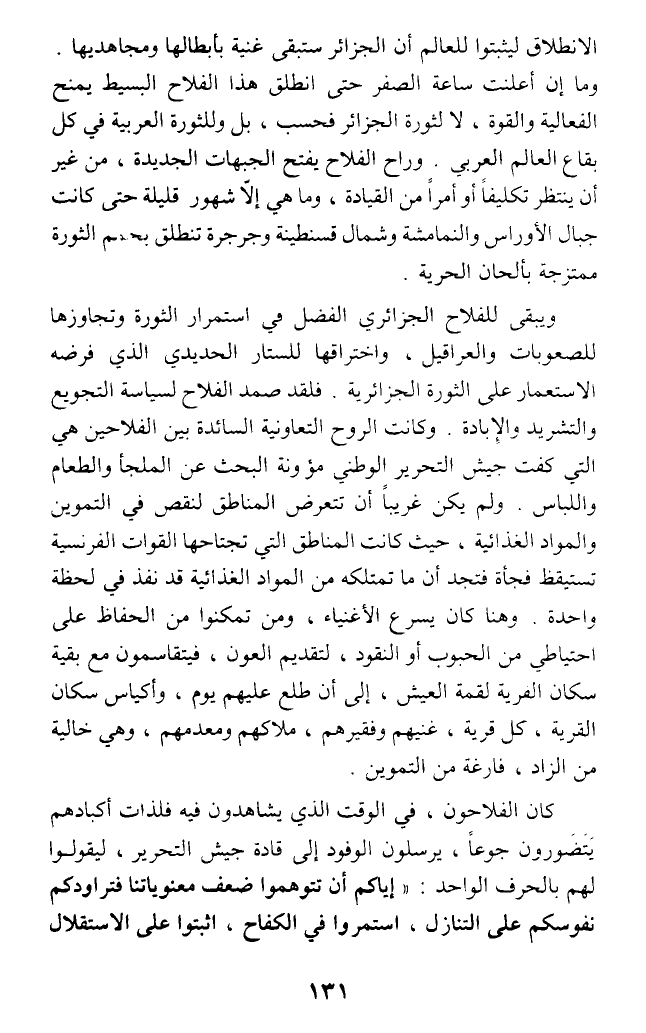 كان الفلاحون، في الوقت الذي يشاهدون فيه فلذات أكبادهم يتضررون جوعا، يرسلون الوفود إلى قادة جيش التحرير، ليقولوا لهم بالحرف الواحد: (إياكم أن تتوهموا ضعف معنوياتنا فتراودكم نفوسكم على التنازل، استمروا في الكفاح، اثبتوا على الاستقلال