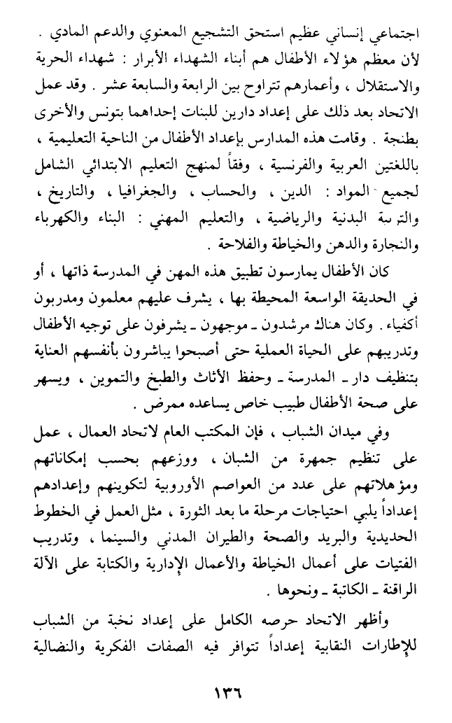 اجتماعي إنساني عظيم استحق التشجيع المعنوي والدعم المادي. لأن معظم هؤلاء الأطفال هم أبناء الشهداء الأبرار: شهداء الحرية والاستقلال، وأعمارهم تتراوح بين الرابعة والسابعة عشر. وقد عمل الاتحاد بعد ذلك على إعداد دارين للبنات إحداهما بتونس والأخرى بطنجة. وقامت هذه المدارس بإعداد الأطفال من الناحية التعليمية، باللغتين العربية والفرنسية، وفقا لمنهج التعليم الابتدائي الشامل لجميع المواد: الدين، والحساب، والجغرافيا، والتاريخ، والتربية البدنية والرياضة، والتعليم المهني: البناء والكهرباء والنجارة والدهن والخياطة والفلاحة.