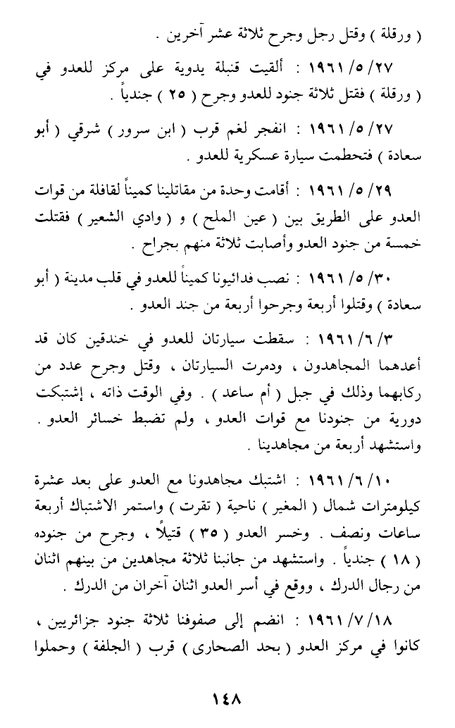 29/ 5/ 1961: أقامت وحدة من مقاتلينا كمينا لقافلة من قوات العدو على الطريق بين (عين الملح) و (وادي الشعير) فقتلت خمسة من جنود العدو وأصابت ثلاثة منهم بجراح.
