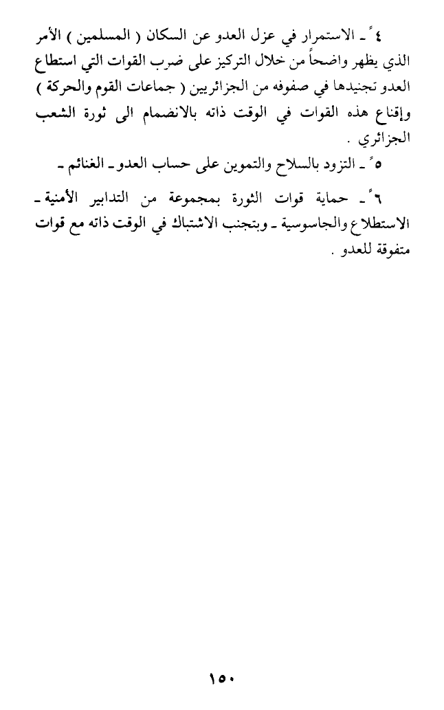 4 - الاستمرار في عزل العدو عن السكان (المسلمين) الأمر الذي يظهر واضحا من خلال التركيز على ضرب القوات التي استطاع العدو تجنيدها في صفوفه من الجزائريين (جماعات القوم والحركة) وإقناع هذه القوات في الوقت ذاته بالانضمام الى ثورة الشعب الجزائري.