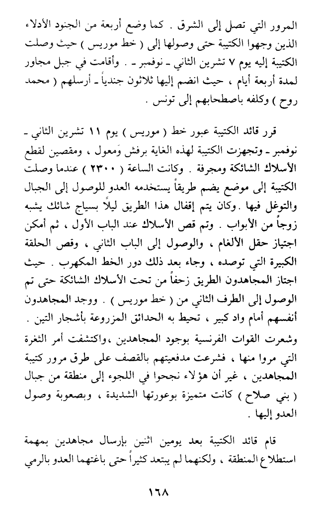 المرور التي تصل إلى الشرق. كما وضع أربعة من الجنود الأدلاء الذين وجهوا الكتيبة حتى وصولها إلى (خط موريس) حيث وصلت الكتيبة إليه يوم 7 تشرين الثاني - نوفمبر -. وأقامت في جبل مجاور لمدة أربعة أيام، حيث انضم إليها ثلاثون جنديا - أرسلهم (محمد روح) وكلفه باصطحابهم إلى تونس.