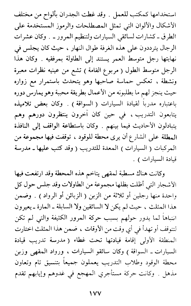 استخدامها كمكتب للعمل. وقد غطت الجدران بألواح من مختلف الأشكال والألوان التي تمثل المصطلحات والرموز المستخدمة على الطرق - كشارات لسائقي السيارات ولتنظيم المرور -. وكان عشرات الرجال يترددون على هذه الغرفة طوال النهار، حيث كان يجلس في نهايتها رجل متوسط العمر يستند إلى الطاولة بمرفقيه. وكان هذا الرجل متوسط الطول (مربوع القامة) تشع من عينيه نظرات معبرة ونشطة، تعكس حماسة صاحبها وهو يتحدث باستمرار مع زواره حيث ينجز لهم ما يطلبونه من الأعمال بطريقة محببة وهو يمارس دوره باعتباره مدربا لقيادة السيارات (السواقة). وكان بعض تلاميذه يتابعون التدريب، في حين كان آخرون ينتظرون دورهم وهم يتبادلون الأحاديث فيما بينهم. وكان باستطاعة الواقف إلى النافدة المطلة على الشارع أن يرى محطة للوقود، توقفت فيها مجموعة من المركبات (السيارات) المعدة للتدريب (وقد كتب عليها - مدرسة قيادة السيارات).