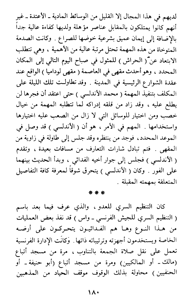 لديهم في هذا المجال إلا القليل من الوسائط المادية - الأعتدة - غير أنهم كانوا يمتلكون بالمقابل عناصر مؤهلة ولديها كفاءة عالية جدا بالإضافة إلى إيمان عميق بشرعية خوضها للصراع. وكانت الصدمة المتوخاة من هذه المهمة تحتل مرتبة عالية من الأهمية، وهي تتطلب الابتعاد عن (الحراش) للمثول في صباح اليوم التالي إلى المكان المحدد، وهو أحدث مقهى في العاصمة (مقهى لوداميا) الواقع عند عقدة الشوارع الرئيسية في المدينة. وقد تطاولت تلك الليلة على المكلف بتنفيذ المهمة (محمد الأندلسي) حتى اعتقد أن فجرها لن يطلع عليه، وقد زاد من قلقه إدراكه لما تتطلبه المهمة من خيال خصب ومن اختيار للوسائل التي لا زال من الصعب عليه اختيارها واستخدامها. المهم في الأمر، هو أن (الأندلسي) قد وصل في الموعد المحدد، فوجد من ينتظره وقد جلس إلى طاولة في زاوية من المقهى. فتم تبادل شارات التعارف من مسافات بعيدة، وتقدم (الأندلسي) فجلس إلى جوار أخيه الفدائي، وبدأ الحديث بينهما على الفور. وكان (الأندلسي) يتحرق شوقا لمعرفة كافة التفاصيل المتعلقة بمهمته المقبلة.
