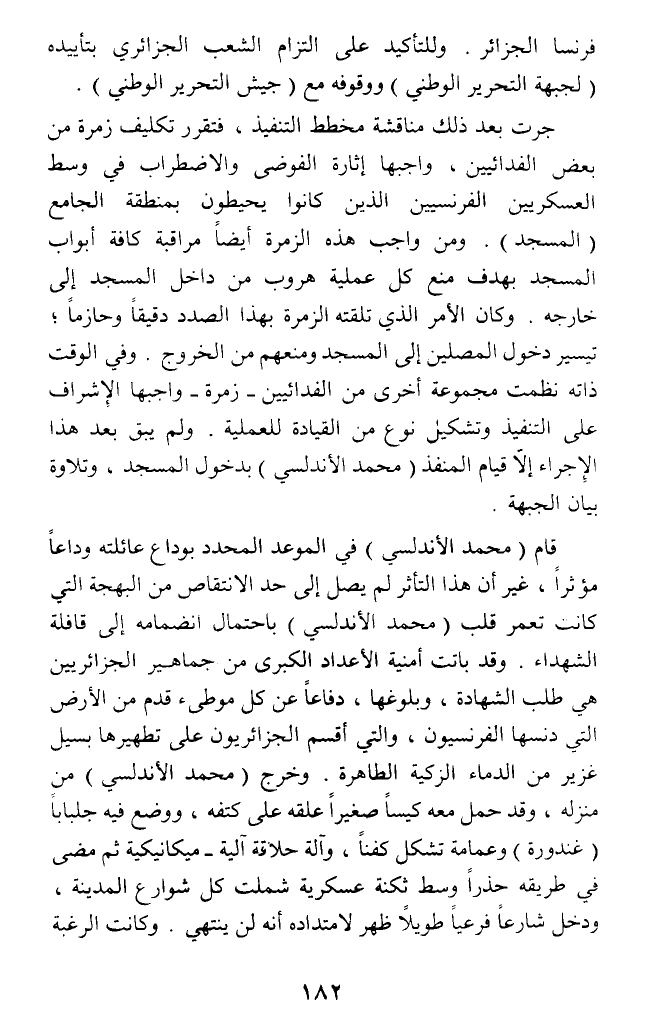 التي دنسها الفرنسيون، والتي أقسم الجزائريون على تطهيرها بسيل غزير من الدماء الزكية الطاهرة. وخرج (محمد الأندلسي) من منزله، وقد حمل معه كيسا صغيرا علقه على كتفه، ووضع فيه جلبابا (غندورة) وعمامة تشكل كفنا، وآلة حلاقة آلية - ميكانيكية ثم مضى في طريقه حذرا وسط ثكنة عسكرية شملت كل شوارع المدينة، ودخل شارعا فرعيا طويلا ظهر لامتداده أنه لن ينتهي. وكانت الرغبة