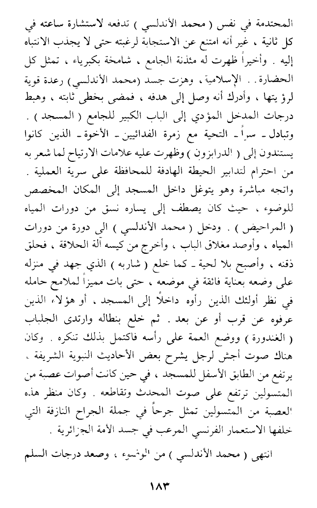 المحتدمة في نفس (محمد الأندلسي) تدفعه لاستشارة ساعته في كل ثانية، غير أنه امتنع عن الاستجابة لرغبته حتى لا يجذب الانتباه إليه. وأخيرا ظهرت له مئذنة الجامع، شامخة بكبرياء، تمثل كل الحضارة .. الإسلامية، وهزت جسد (محمد الأندلسي) رعدة قوية لرؤيتها، وأدرك أنه وصل إلى هدفه، فمضى بخطى ثابته، وهبط درجات المدخل المؤدي إلى الباب الكبير للجامع (المسجد). وتبادل - سرا - التحية مع زمرة الفدائيين - الأخوة - الذين كانوا يستندون إلى (الدرابزوق) وظهرت عليه علامات الارتياح لما شعر به من احترام لتدابير الحيطة الهادفة للمحافظة على سرية العملية. واتجه مباشرة وهو يتوغل داخل المسجد إلى المكان المخصص للوضوء، حيث كان يصطف إلى يساره نسق من دورات المياه (المراحيض). ودخل (محمد الأندلسي) الى دورة من دورات المياه، وأوصد مغلاق الباب، وأخرج من كيسه آلة الحلاقة، فحلق ذقنه، وأصبح بلا لحية - كما خلع (شاربه) الذي جهد في منزله على وضعه بعناية فائقة في موضعه، حتى بات مميزا لملامح حامله في نظر أولئك الذين رأوه داخلا إلى المسجد، أو هؤلاء الذين عرفوه عن قرب أو عن بعد. ثم خلع بنطاله وارتدى الجلباب (الغندورة) ووضع العمة على رأسه فاكتمل بذلك تنكره. وكان هناك صوت أجش لرجل يشرح بعض الأحاديث النبوية الشريفة، يرتفع من الطابق الأسفل للمسجد، في حين كانت أصوات عصبة من المتسولين ترتفع على صوت المحدث وتقاطعه. وكان منظر هذه العصبة من المتسولين تمثل جرحا في جملة الجراح النازفة التي خلفها الاستعمار الفرنسي المرعب في جسد الأمة الجزائرية.