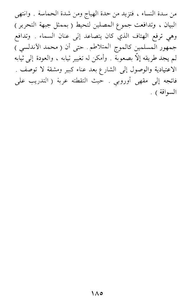 من سدة النساء، فتزيد من حدة الهياج ومن شدة الحماسة. وانتهى البيان، وتدافعت جموع المصلين لتحيط (بممثل جبهة التحرير) وهي ترفع الهتاف الذي كان يتصاعد إلى عنان السماء. وتدافع جمهور المسلمين كالموج المتلاطم. حتى أن (محمد الأندلسي) لم يجد طريقه إلا بصعوبة. وأمكن له تغيير ثيابه، والعودة إلى ثيابه الاعتيادية والوصول إلى الشارع بعد عناء كبير ومشقة لا توصف. فاتجه إلى مقهى أوروبي. حيث التقطته عربة (التدريب على السواقة).