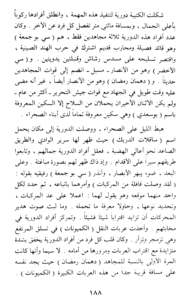هبط الليل على الصحراء، ووصلت الدورية إلى مكان يحمل اسم (ساقلات الدريك) حيث ظهر لها سرير الوادي والطريق الصاعد نحو أعالي الهضبة، فعقل أفراد الدورية جمالهم، وتابعوا طريقهم سيرا على الأقدام. وإذ ذاك ظهر لهم بصورة مباغتة. وعلى البعد، ضوء يبهر الأبصار، وأنذر (سي بو جمعة) رفيقيه بقوله: (لقد وصلت قافلة من المركبات) وأمرهما باتباعه، ثم حدد لكل واحد منهما موقعه وهو يقول لهما: اعملا على عد المركبات، وتحديد نوعها، وحاولا معرفة ما تحمله. وما لبث صوت هدير المحركات أن تزايد اقترابا شيئا فشيئا. وتمركز أفراد الدورية في مخابئهم. وأخذت عربات النقل (الكميونات) في تسلق المرتفع وهي تزمجر وتزأر. وكان قلب كل فرد من أفراد الدورية يخفق بشدة متزايدة مع اقتراب العربات ومرورها من أمامه. لا سيما وأنها كانت المرة الأولى بالنسبة للمجاهد (دهمان رمضان) حيث يجد نفسه على مسافة قريبة جدا من هذه العربات الكبيرة (الكميونات)