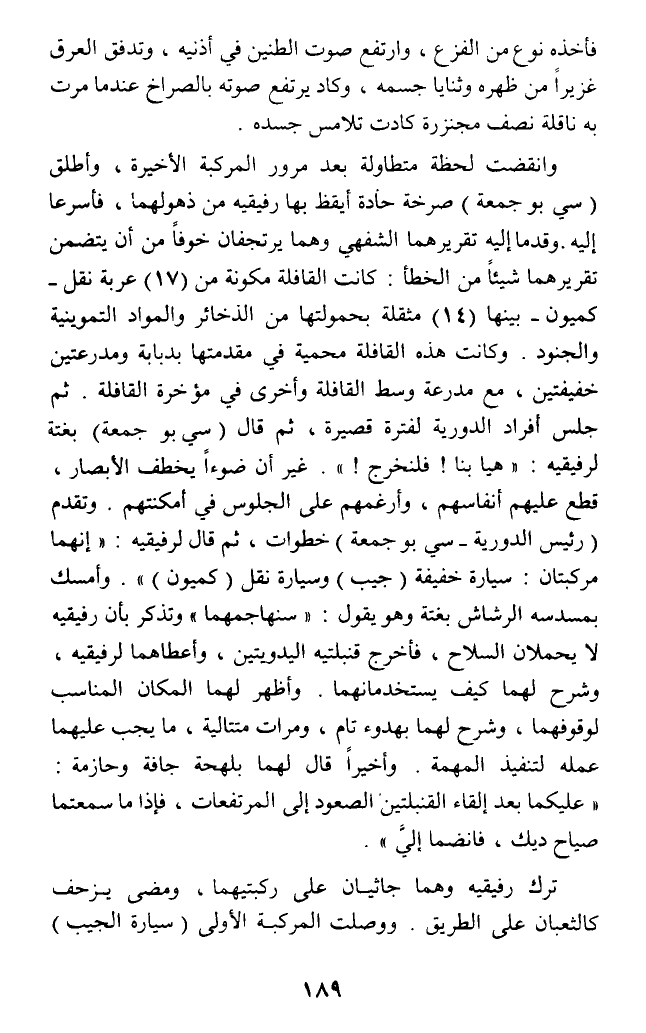 وانقضت لحظة متطاولة بعد مرور المركبة الأخيرة، وأطلق (سي بوجمعة) صرخة حادة أيقظ بها رفيقيه من ذهولهما، فأسرعا إليه وقدما إليه تقريرهما الشفهي وهما يرتجفان خوفا من أن يتضمن تقريرها شيئا من الخطأ: كانت القافلة مكونة من (17) عربة نقل - كميون - بينها (14) مثقلة بحمولتها من الذخائر والمواد التموينية والجنود. وكانت هذه القافلة محمية في مقدمتها بدبابة ومدرعتين خفيفتين، مع مدرعة وسط القافلة وأخرى في مؤخرة القافلة. ثم جلس أفراد الدورية لفترة قصيرة، ثم قال (سي بو جمعة) بغتة لرفيقيه: (هيا بنا! فلنخرج!). غير أن ضوءا يخطف الأبصار، قطع عليهم أنفاسهم، وأرغمهم على الجلوس في أمكنتهم. وتقدم (رئيس الدورية - سي بوجمعة) خطوات، ثم قال لرفيقيه: (إنهما مركبتان: سيارة خفيفة (جيب) وسيارة نقل (كميون)). وأمسك بمسدسه الرشاش بغتة وهو يقول: (سنهاجمهما) وتذكر بأن رفيقيه لا يحملان السلاح، فأخرج قنبلتيه اليدويتين، وأعطاهما لرفيقيه، وشرح لهما كيف يستخدمانهما. وأظهر لهما المكان المناسب لوقوفهما، وشرح لهما بهدوء تام، ومرات متتالية، ما يجب عليهما عمله لتنفيذ المهمة وأخيرا قال لهما بلهجة جافة وحازمة: (عليكما بعد إلقاء القنبلتين الصعود إلى المرتفعات، فإذا ما سمعتما صياح ديك، فانضما إلي).