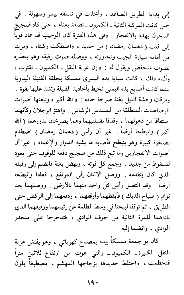 إلى بداية الطريق الصاعد، وأخذت في تسلقه بيسر وسهولة. في حين كانت المركبة الثانية - الكميون - تصعد بعناء، حتى كاد ضجيج المحرك يهدد بالانفجار. وفي هذه الفترة كان الوجيب قد عاد قويا إلى قلب (دهمان رمضان) من جديد، واصطكت ركبتاه، ومرت من أمامه سيارة الجيب وتجاوزته، ووصله صوت رفيقه وهو يحذره بصوت منخفض ويقول له: (إن عربة النقل - الكميون - تقترب) وأثناء ذلك، كانت سبابة يده اليسرى ممسكة بحلقة القنبلة اليدوية بينما كانت أصابع يده اليمنى تحيط بأخاديد القنبلة وتشد عليها بقوة. ومزقت وحشة الليل بغتة صرخة حادة: (الله أكبر) وتبعتها أصوات الرصاصات المنطلقة من المسدس الرشاش. واهتز الرجلان وكأنهما استفاقا من ذهولهما، وقذفا بقنبلتيهما وهما يصرخان بدورهما (الله أكبر) وانبطحا أرضا. غير أن رأس (دهمان رمضان) اصطدم بصخرة كبيرة وهو ينبطح فأصابه ما يشبه الدوار والإغماء، غير أن أصوات الانفجارين وما تبع ذلك من ضجيح دفعه للوقوف حتى يعود للسقوط من جديد. وجمع كل قوته، ونهض بغتة فانضم إلى رفيقه الذي كان يتقدمه. ووصل الاثنان إلى المرتفع، فعادا وانبطحا أرضا. وقد التصق رأس كل واحد منهما بالأرض. ووصلهما بعد ثوان (صياح الديك) فأيقظهما وأوقفهما، ودفعهما إلى الركض حتى الطريق، ثم توقفا ليبحثا في وسط الظلمة عن رئيسهما ورفيقهما الذي ناداهما للمرة الثانية من جوف الوادي، فتدحرجا على منحدر الوادي، وانضما إليه.