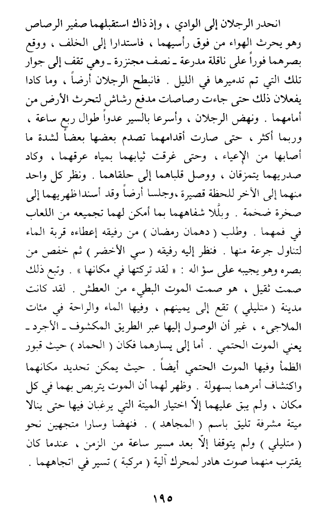 انحدر الرجلان إلى الوادي، وإذ ذاك استقبلهما صفير الرصاص وهو يحرث الهواء من فوق رأسهما، فاستدارا إلى الخلف، ووقع بصرهما فورا على ناقلة مدرعة - نصف مجنزرة - وهي تقف إلى جوار تلك التي تم تدميرها في الليل. فانبطح الرجلان أرضا، وما كادا يفعلان ذلك حتى جاءت رصاصات مدفع رشاش لتحرث الأرض من أمامهما. ونهض الرجلان، وأسرعا بالسير عدوا طوال ربع ساعة، وربما أكثر، حتى صارت أقدامهما تصدم بعضها بعضا لشدة ما أصابها من الإعياء، وحتى غرقت ثيابهما بمياه عرقهما، وكاد صدريهما يتمزقان، ووصل قلباهما إلى حلقاهما. ونظر كل واحد منهما إلى الآخر للحظة قصيرة، وجلسا أرضا وقد أسندا ظهريهما إلى صخرة ضخمة. وبللا شفاههما بما أمكن لهما تجميعه من اللعاب في فمهما. وطلب (دهمان رمضان) من رفيقه إعطاءه قربة الماء لتناول جرعة منها. فنظر إليه رفيقه (سي الأخضر) ثم خفص من بصره وهو يجيبه على سؤاله: (لقد تركتها في مكانها). وتبع ذلك صمت ثقيل، هو صمت الموت البطيء من العطش. لقد كانت مدينة (متليلي) تقع إلى يمينهم، وفيها الماء والراحة في مئات الملاجىء، غير أن الوصول إليها عبر الطريق المكشوف - الأجرد - يعني الموت الحتمي. أما إلى يسارهما فكان (الحماد) حيث قبور الظمأ وفيها الموت الحتمي أيضا. حيث يمكن تحديد مكانهما واكتشاف أمرهما بسهولة. وظهر لهما أن الموت يتربص بهما في كل مكان، ولم يبق عليهما إلا اختيار الميتة التي يرغبان فيها حتى ينالا ميتة مشرفة تليق باسم (المجاهد). فنهضا وسارا متجهين نحو (متليلي) ولم يتوقفا إلا بعد سير ساعة من الزمن، عندما كان يقترب منهما صوت هادر لمحرك آلية (مركبة) تسير في اتجاههما.