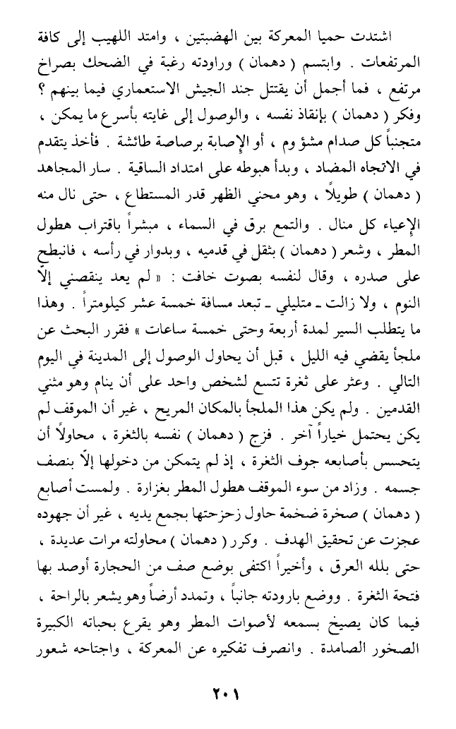 اشتدت حميا المعركة بين الهضبتين، وامتد اللهيب إلى كافة المرتفعات. وابتسم (دهمان) وراودته رغبة في الضحك بصراخ مرتفع، فما أجمل أن يقتتل جند الجيش الاستعماري فيما بينهم؟ وفكر (دهمان) بإنقاذ نفسه، والوصول إلى غايته بأسرع ما يمكن، متجنبا كل صدام مشؤوم، أو الإصابة برصاصة طائشة. فأخذ يتقدم في الاتجاه المضاد، وبدأ هبوطه على امتداد الساقية. سار المجاهد (دهمان) طويلا، وهو محني الظهر قدر المستطاع، حتى نال منه الإعياء كل منال والتمع برق في السماء، مبشرا باقتراب هطول المطر، وشعر (دهمان) بثقل في قدميه، وبدوار في رأسه، فانبطح على صدره، وقال لنفسه بصوت خافت: (لم يعد ينقصني إلا النوم، ولا زالت - متليلي - تبعد مسافة خمسة عشر كيلومترا وهذا ما يتطلب السير لمدة أربعة وحتى خمسة ساعات) فقرر البحث عن ملجأ يقضي فيه الليل، قبل أن يحاول الوصول إلى المدينة في اليوم التالي. وعثر على ثغرة تتسع لشخص واحد على أن ينام وهو مثني القدمين. ولم يكن هذا الملجأ بالمكان المريح، غير أن الموقف لم يكن يحتمل خيارا آخر. فزج (دهمان) نفسه بالثغرة، محاولا أن يتحسس بأصابعه جوف الثغرة، إذ لم يتمكن من دخولها إلا بنصف جسمه. وزاد من سوء الموقف هطول المطر بغزارة. ولمست أصابع (دهمان) صخرة صخمة حاول زحزحتها بجميع يديه، غير أن جهوده عجزت عن تحقيق الهدف. وكرر (دهمان) محاولته مرات عديدة، حتى بلله العرق، وأخيرا اكتفى بوضع صف من الحجارة أوصد بها فتحة الثغرة. ووضع بارودته جانبا، وتمدد أرضا وهو يشعر بالراحة، فيما كان يصيخ بسمعه لأصوات المطر وهو يقرع بحباته الكبيرة الصخور الصامدة. وانصرف تفكيره عن المعركة، واجتاحه شعور