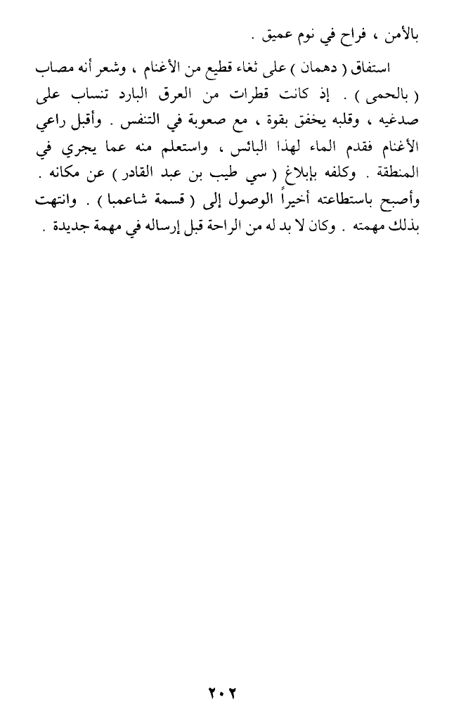 استفاق (دهمان) على ثغاء قطع من الأغنام، وشعر أنه مصاب (بالحمى). إذ كانت قطرات من العرق البارد تنساب على صدغيه، وقلبه يخفق بقوة، مع صعوبة في التنفس. وأقبل راعي الأغنام فقدم الماء لهذا البائس، واستعلم منه عما يجري في المنطقة. وكلفه بإبلاغ (سي طيب بن عبد القادر) عن مكانه. وأصبح باستطاعته أخيرا الوصول إلى (قسمة شاعمبا). وانتهت بذلك مهمته. وكان لا بد له من الراحة قبل إرساله في مهمة جديدة.