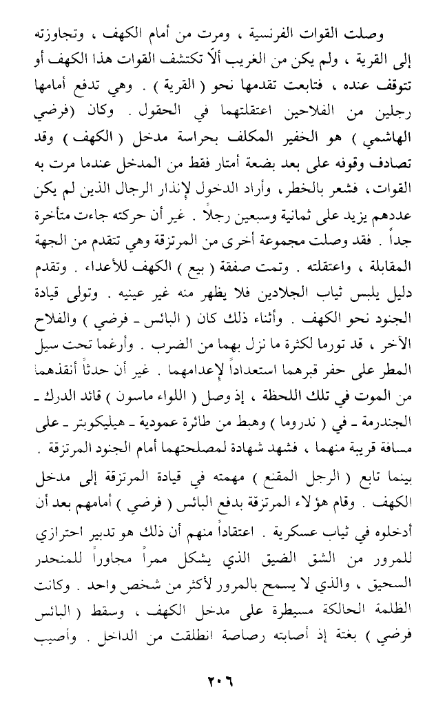 وصلت القوات الفرنسية، ومرت من أمام الكهف، وتجاوزته إلى القرية، ولم يكن من الغريب ألا تكتشف القوات هذا الكهف أو تتوقف عنده، فتابعت تقدمها نحو (القرية). وهي تدفع أمامها رجلين من الفلاحين اعتقلتهما في الحقول. وكان (فرضي الهاشمي) هو الخفير المكلف بحراسة مدخل (الكهف) وقد تصادف وقوفه على بعد بضعة أمتار فقط من المدخل عندما مرت به القوات، فشعر بالخطر، وأراد الدخول لإنذار الرجال الذين لم يكن عددهم يزيد على ثمانية وسبعين رجلا. غير أن حركته جاءت متأخرة جدا. فقد وصلت مجموعة أخرى من المرتزقة وهي تتقدم من الجهة المقابلة، واعتقلته. وتمت صفقة (بيع) الكهف للأعداء. وتقدم دليل يلبس ثياب الجلادين فلا يظهر منه غير عينيه. وتولى قيادة الجنود نحو الكهف. وأثناء ذلك كان (البائس - فرضي) والفلاح الآخر، قد تورما لكثرة ما نزل بهما من الضرب. وأرغما تحت سيل المطر على حفر قبرهما استعدادا لإعدامهما. غير أن حدثا أنقذهما من الموت في تلك اللحظة، إذ وصل (اللواء ماسون) قائد الدرك - الجندرمة - في (ندروما) وهبط من طائرة عمودية - هيليكوبتر - على مسافة قريبة منهما، فشهد شهادة لمصلحتهما أهام الجنود المرتزقة. بينما تابع (الرجل المقنع) مهمته في قيادة المرتزقة إلى مدخل الكهف. وقام هؤلاء المرتزقة بدفع البائس (فرضي) أمامهم بعد أن أدخلوه في ثياب عسكرية. اعتقادا منهم أن ذلك هو تدبير احترازي للمرور من الشق الضيق الذي يشكل ممرا مجاورا للمنحدر السحيق، والذي لا يسمح بالمرور لأكثر من شخص واحد. وكانت الظلمة الحالكة مسيطرة على مدخل الكهف، وسقط (البائس فرضي) بغتة إذ أصابته رصاصة انطلقت من الداخل. وأصيب