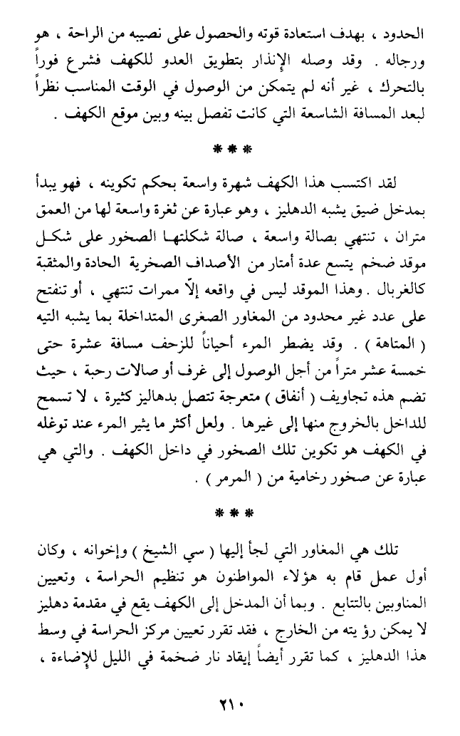تلك هي المغاور التي لجأ إليها (سي الشيخ) وإخوانه، وكان أول عمل قام به هؤلاء المواطنون هو تنظيم الحراسة، وتعيين المناوبين بالتتابع. وبما أن المدخل إلى الكهف يقع في مقدمة دهليز لا يمكن رؤيته من الخارج، فقد تقرر تعيين مركز الحراسة في وسط هذا الدهليز، كما تقرر أيضا إيقاد ناز ضخمة في الليل للإضاءة،