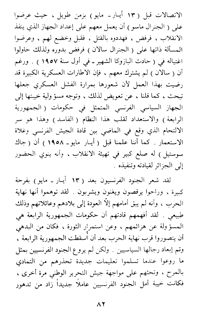 الاتصالات قبل (13 أيار- مايو) بزمن طريل، حيث عرضوا على (الجنرال ماسو) أن يعمل معهم على إعداد الجهاز الذي ينفذ الانقلاب، فرفض، فهددوه بالقتل، فقبل وخضع لهم، وعرضوا المسألة ذاتها على (الجنرال سالان) فرفض بدوره ولذلك حاولوا اغتياله في (حادث البازوكا الشهير- في أول سنة 1957). ورغم أن (سالان) لم يشترك معهم، فإن الاطارات العسكرية الكبيرة قد رضيت بهذا العمل لأن شعورها بمرارة الفشل العسكري جعلها تبحث، كما قلنا، عن تعويض لذلك، وتوجه مسؤولية خيبتها إلى الجهاز السياسي الفرنسي المتمثل في حكومات (الجمهورية الرابعة) والاستعداد لقلب هذا النظام (الفاسد) وهذا هو سر الالتحام الذي وقع في الماضي بين قادة الجيش الفرنسي وغلاة الاستعمار. كما أننا علمنا قبل (أيار مايو- 1958) أن (جاك سوستيل) له ضلع كبير في تهيئة الانقلاب، وأنه ينوي الحضور إلى الجزائر لقيادته وتنفيذه.