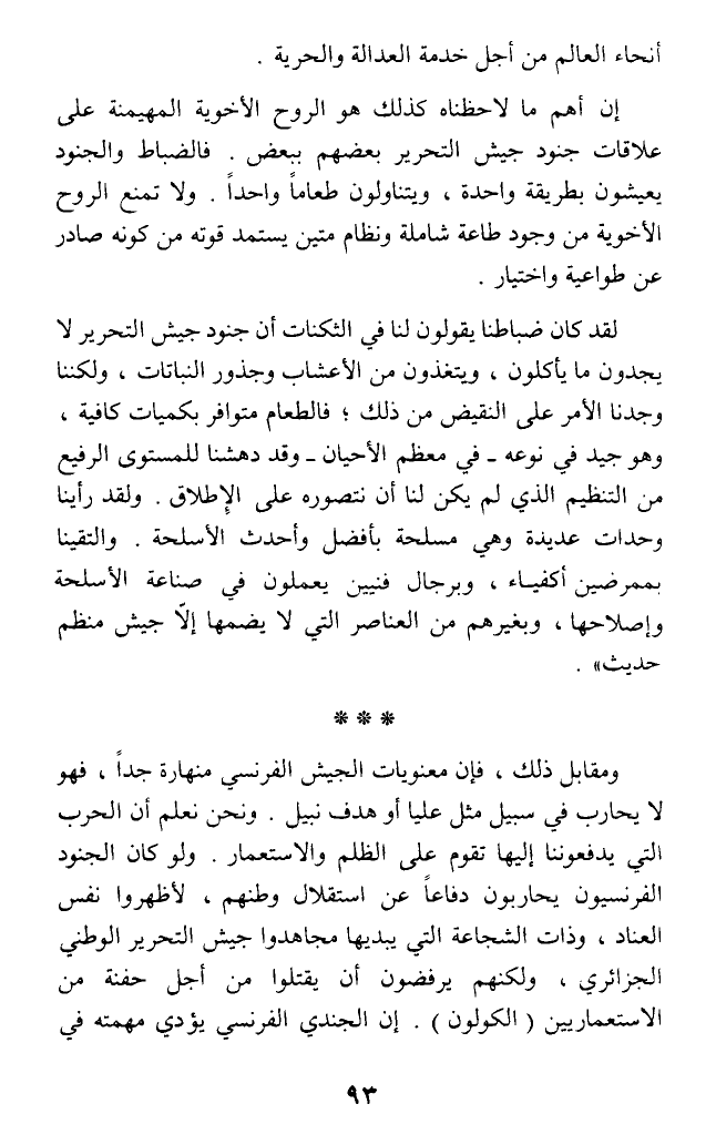 ومقابل ذلك، فإن معنويات الجيش الفرنسي منهارة جدا، فهو لا يحارب في سبيل مثل عليا أو هدف نبيل. ونحن نعلم أن الحرب التي يدفعوننا إليها تقوم على الظلم والاستعمار. ولو كان الجنود الفرنسيون يحاربون دفاعا عن استقلال وطنهم، لأظهروا نفس العناد، وذات الشجامعة التي يبديها مجاهدوا جيش التحرير الوطني