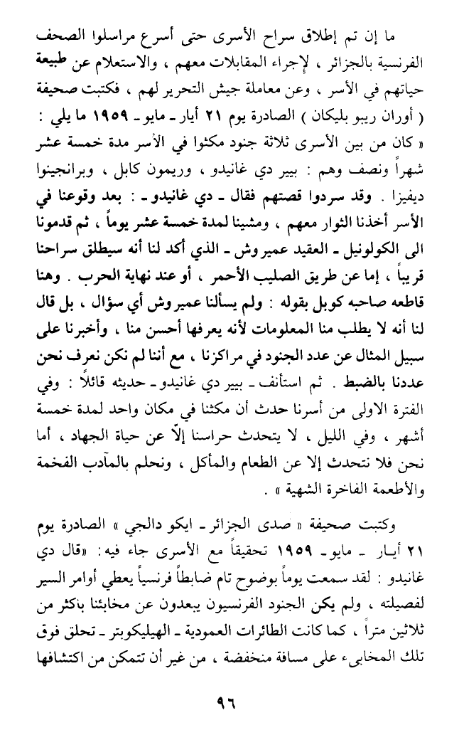 ما إن تم إطلاق سراح الأسرى حتى أسرع مراسلوا الصحف الفرنسية بالجزائر، لإجراء المقابلات معهم، والاستعلام عن طبيعة حياتهم في الأسر، وعن معاملة جيش التحرير لهم، فكتبت صحيفة (أوران ريبو بليكان) الصادرة يوم 21 أيار - مايو- 1959 ما يلي: (كان من بين الأسرى ثلاثة جنود مكثوا في الأسر مدة خمسة عشر شهرا ونصف وهم: بيير دي غانيدو، وريمون كابل، وبرانجينوا ديفيزا. وقد سردوا قصتهم فقال - دي غانيدو-: بعد وقوعنا في الأسر أخذنا الثوار معهم، ومشينا لمدة خمسة عشر يوما، ثم قدمونا الى الكولونيل - العقيد عميروش - الذي أكد لنا أنه سيطلق سراحنا قريبا، إما عن طريق الصليب الأحمر، أو عند نهاية الحرب. وهنا قاطعه صاحبه كوبل بقوله: ولم يسألنا عميروش أي سؤال، بل قال لنا أنه لا يطلب منا المعلومات لأنه يعرفها أحسن منا، وأخبرنا على سبيل المثال عن عدد الجنود في مراكزنا، مع أننا لم نكن نعرف نحن عددنا بالضبط. ثم استأنف - بيير دي غانيدو- حديثه قائلا: وفي الفترة الاولى من أسرنا حدث أن مكثنا في مكان واحد لمدة خمسة أشهر، وفي الليل، لا يتحدث حراسنا إلا عن حياة الجهاد، أما نحن فلا نتحدث إلا عن الطعام والمأكل، ونحلم بالمآدب الفخمة والأطعمة الفاخرة الشهية).