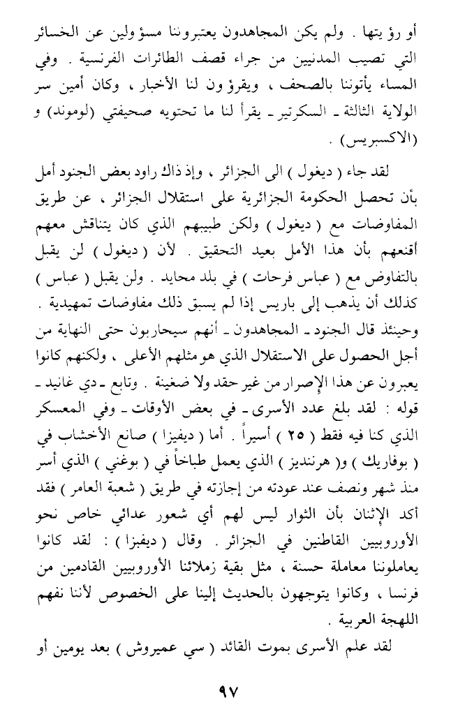 لقد جاء (ديغول) الى الجزائر، وإذ ذاك راود بعض الجنود أمل بأن تحصل الحكومة الجزائرية على استقلال الجزائر، عن طريق المفاوضات مع (ديغول) ولكن طبيبهم الذي كان يتناقش معهم أقنعهم بأن هذا الأمل بعيد التحقيق. لأن (ديغول) لن يقبل بالتفاوض مع (عباس فرحات) في بلد محايد. ولن يقبل (عباس) كذلك أن يذهب إلى باريس إذا لم يسبق ذلك مفاوضات تمهيدية. وحينئذ قال الجنود - المجاهدون - أنهم سيحاربون حتى النهاية من أجل الحصول على الاستقلال الذي هو مثلهم الأعلى، ولكنهم كانوا يعبرون عن هذا الإصرار من غير حقد ولا ضغينة. وتابع - دي غانيد -قوله: لقد بلغ عدد الأسرى - في بعض الأوقات - وفي المعسكر الذي كنا فيه فقط (25) أسيرا. أما (ديفيزا) صانع الأخشاب في (بوفاريك) و (هرننديز) الذي يعمل طباخا في (بوغني) الذي أسر منذ شهر ونصف عند عودته من إجازته في طريق (شعبة العامر) فقد أكد الاثنان بأن الثوار ليس لهم أي شعور عدائي خاص نحو الأوروبيين القاطنين في الجزائر - وقال (ديفيزا): لقد كانوا