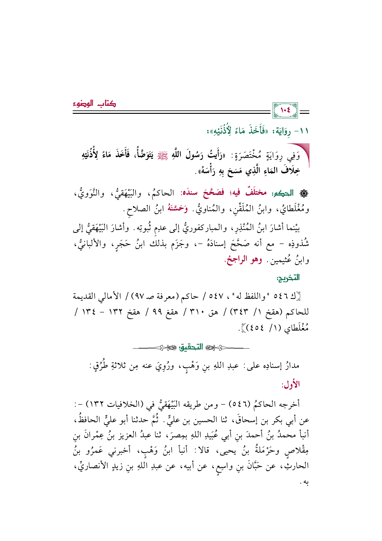 • وَفِي رِوَايَةٍ مُخْتَصَرَةٍ: ((رَأَيتُ رَسُولَ اللَّهِ صلى الله عليه وسلم يَتَوَضَّأُ، فَأَخَذَ مَاءً لِأُذُنَيْهِ خِلَافَ المَاءِ الَّذِي مَسَحَ بِهِ رَأْسَهُ)).