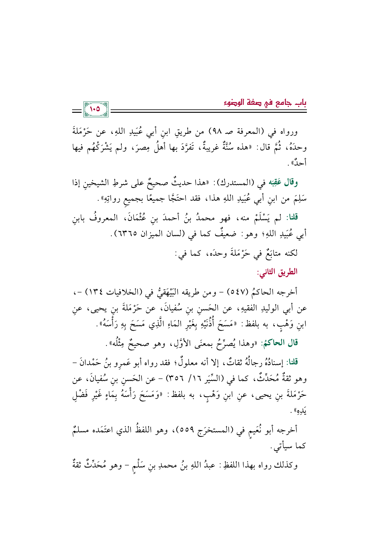 قلنا: إسنادُهُ رجالُهُ ثقاتٌ، إلا أنه معلولٌ؛ فقد رواه أبو عَمرِو بنُ حَمْدانَ -وهو ثقةٌ مُحَدِّثٌ، كما في (السِّيَر ١٦/ ٣٥٦) - عن الحَسنِ بنِ سُفيانَ، عن حَرْمَلةَ بنِ يحيى، عنِ ابنِ وَهْبٍ، به بلفظ: ((وَمَسَحَ رَأْسَهُ بِمَاءٍ غَيْرِ فَضْلِ يَدِهِ)).