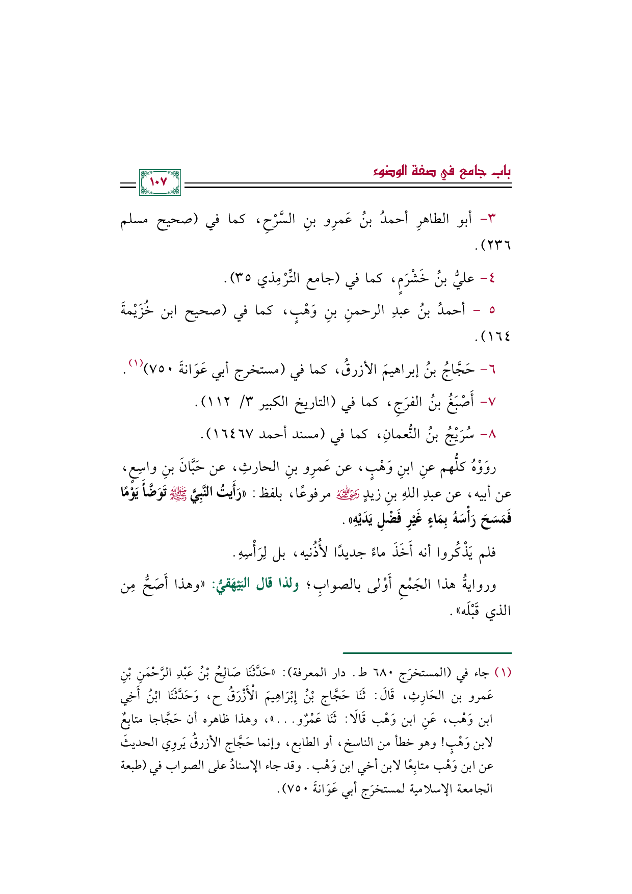 (¬١) جاء في (المستخرَج ٦٨٠ ط. دار المعرفة): "حَدَّثَنَا صَالِحُ بْنُ عَبْدِ الرَّحْمَنِ بْنِ عَمرو بن الحَارِثِ، قَالَ: ثَنَا حَجَّاج بْنُ إِبْرَاهِيمَ الْأَزْرَقُ ح، وَحَدَّثَنَا ابْنُ أَخِي ابن وَهْب، عَنِ ابن وَهْب قَالَا: ثَنَا عَمْرٌو ... "، وهذا ظاهره أن حَجَّاجا متابِعٌ لابن وَهْبٍ! وهو خطأ من الناسخ، أو الطابع، وإنما حَجَّاج الأزرقُ يَروِي الحديثَ عن ابن وَهْب متابِعًا لابن أخي ابن وَهْب. وقد جاء الإسنادُ على الصواب في (طبعة الجامعة الإسلامية لمستخرَج أبي عَوَانةَ ٧٥٠).