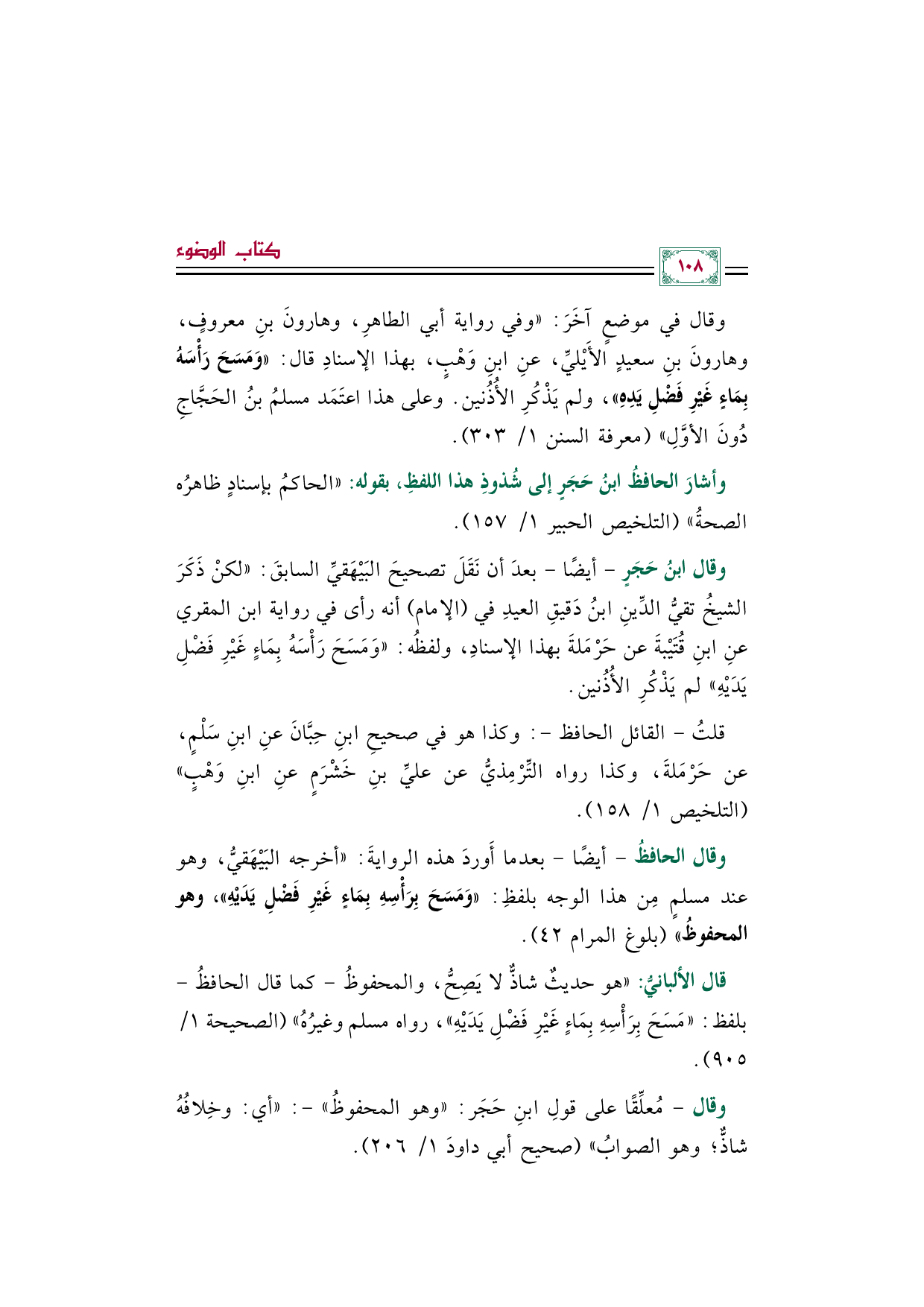 وقال ابنُ حَجَرٍ -أيضًا- بعدَ أن نَقَلَ تصحيحَ البَيْهَقيِّ السابقَ: ((لكنْ ذَكَرَ الشيخُ تقيُّ الدِّينِ ابنُ دَقيقِ العيدِ في (الإمام) أنه رأى في رواية ابن المقري عنِ ابنِ قُتَيْبةَ عن حَرْمَلةَ بهذا الإسنادِ، ولفظُه: ((وَمَسَحَ رَأْسَهُ بِمَاءٍ غَيْرِ فَضْلِ يَدَيْهِ)) لم يَذْكُرِ الأُذُنين.